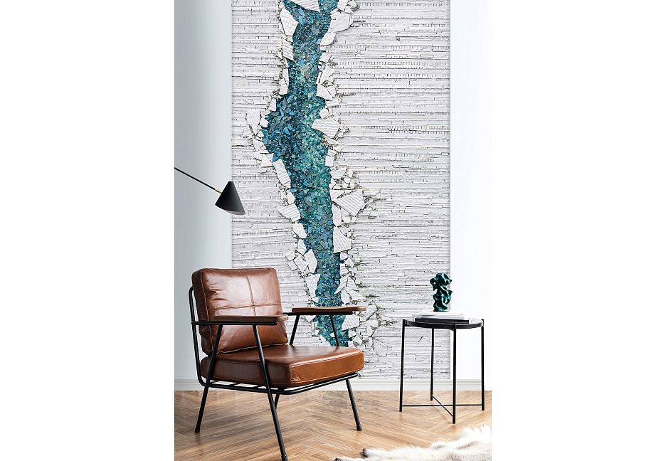 Панно размером 140×240 см, сочетает натуральный белый мрамор и бирюзовую смальту. Этот дуэт материалов создаёт иллюзию бесконечной глубины байкальских вод, где холод камня встречается с живым мерцанием стекла. Центральный элемент — вертикальный «разлом», имитирующий природную трещину в горной породе. Смальта выложена так, чтобы создать эффект погружения.
