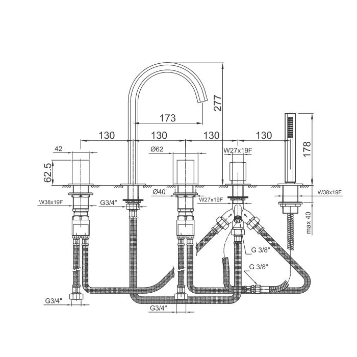 Fantini Venezia Смеситель на борт ванны, 5 отв., с ручн душем, излив 175мм, цвет: хром