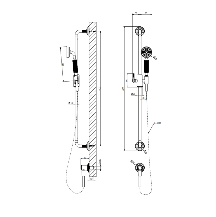 Gessi Venti20 Штанга для душа 800 мм., с ручным душем, шлангом 1500 мм. и подводом воды, Finox Brushed Nickel