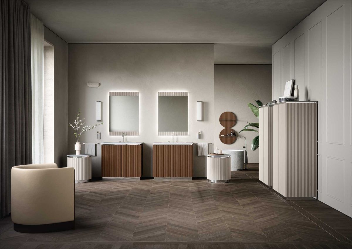 Комплект мебели Oasis Naos напольный, мраморная столешница, bianco carrara, Отделка: Рифленая текстура ореха / Хром