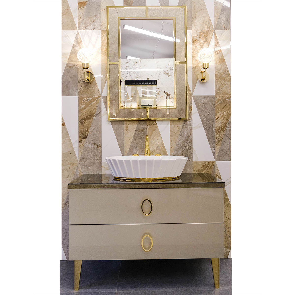 EXPO Комп.Oasis Daphne Зеркало 70xh100см. Светильники, Metal Gold. Раковина Plesse. Столешница 110х53см, Vetro Saffiano. Тумба, цвет Prosecco коллекции Комплекты мебели Oasis Daphne можно купить по розничной цене в нашем шоу-руме в Москве по адресу ул. Дениса Давыдова, д. 4 или через наш интернет-магазин StudioArdo.