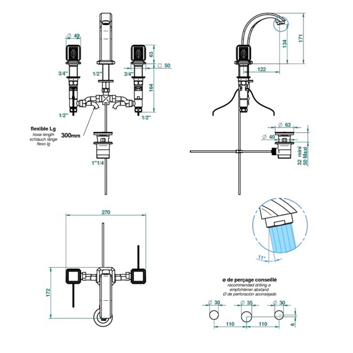 THG Métropolis cristal clair Смеситель для раковины на 3 отверстия, ручки с подсветкой, с донным клапаном, цвет: хром
