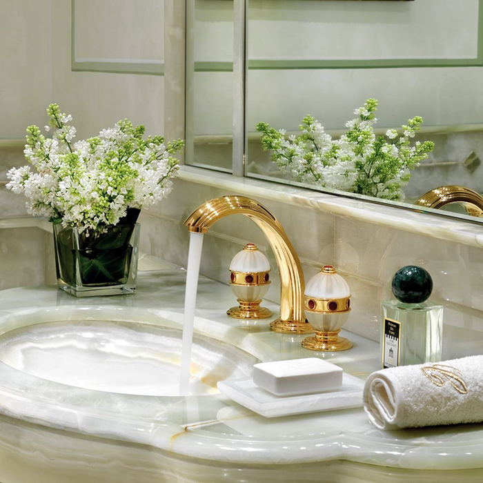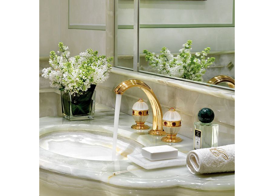 THG Amboise Jaspe rouge Смеситель для раковины, 3 отв., цвет: золото/красная яшма коллекции Amboise Jaspe rougе можно купить по розничной цене в нашем шоу-руме в Москве по адресу ул. Дениса Давыдова, д. 4 или через наш интернет-магазин StudioArdo.