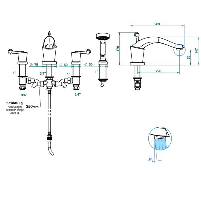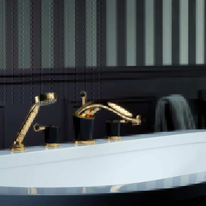 THG BAGATELLE PIERRE NOIRE MANETTES Смеситель для для установки на борт ванны на 4 отверстия, с ручным душем, ручки черные, цвет: полированное золото коллекции Bagatelle pierre noire можно купить по розничной цене в нашем шоу-руме в Москве по адресу ул. Дениса Давыдова, д. 4 или через наш интернет-магазин StudioArdo.