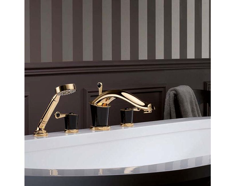 THG Bagatelle pierre noire Смеситель для раковины на 3 отверстия, с донным клапаном, ручки черные, цвет: полированное золото
