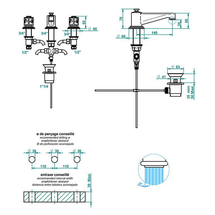 THG CAPUCINE MAUVE DECOR OR Смеситель для раковины на 3 отверстия, с донным клапаном, декор золото/лиловый, цвет: полированное золото