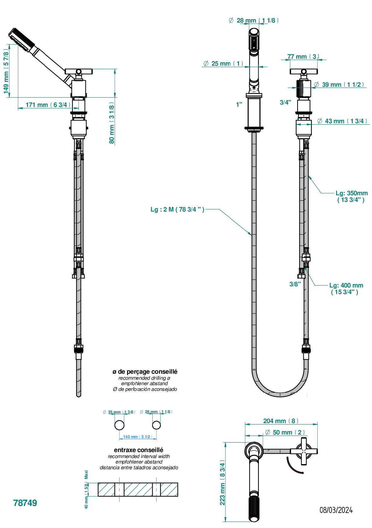 Смеситель THG Estrela устанавливаемый на борту с ручным душем с ручкой одновременной регулировки – потока/температуры