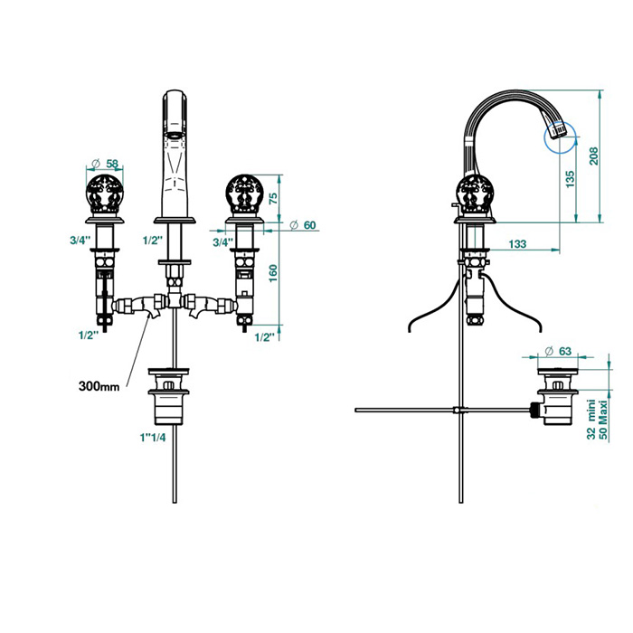 THG Flore Смеситель для раковины на 3 отверстия, ручки с подсветкой, с донным клапаном, цвет: хром