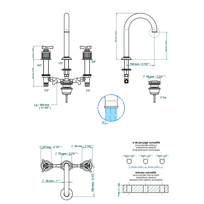 THG Hamptons Смеситель для раковины, на 3 отв, в комплекте с донным клапаном, цвет: Polished nickel