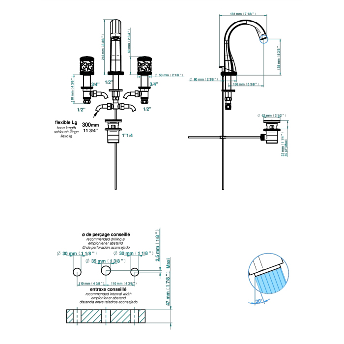 THG Hirondelles Platinum Stamped Смеситель для раковины, 3 отв., цвет: Polished nickel
