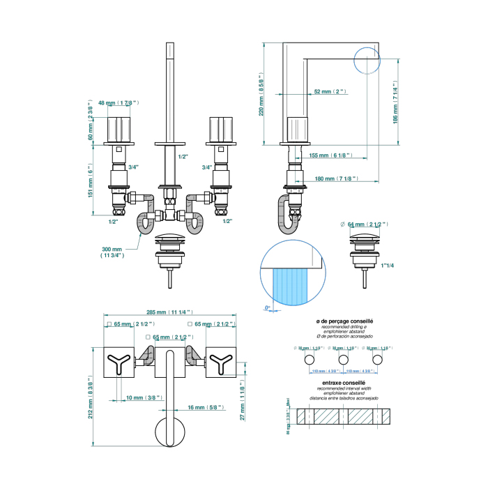 THG ICON-X CARBONE GOLD Смеситель для раковины, 3 отв., с донным клапаном, цвет: полированное золото