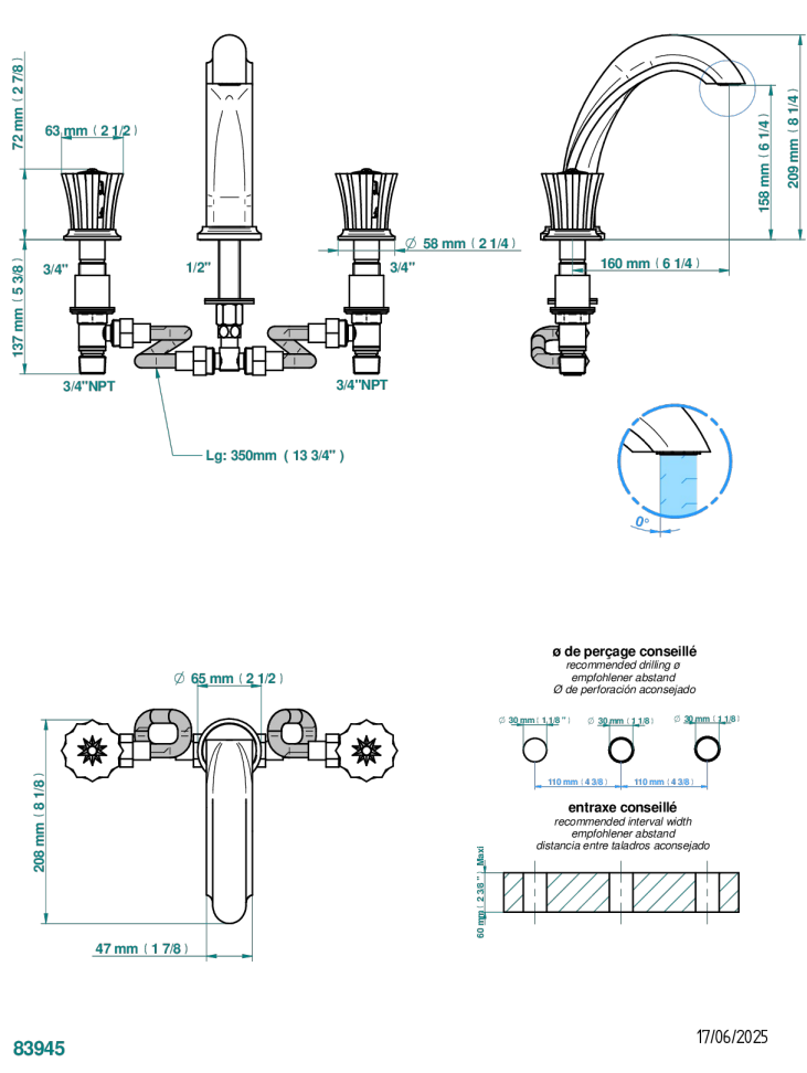 Смеситель для ванны THG Mille Nuits - Brume crystal на 3 отверстия устанавливаемый на борту - излив ГОЛИАФ