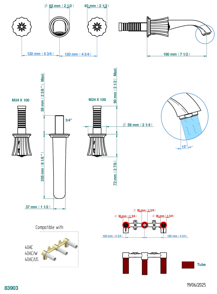 Внешняя часть смесителя THG Mille Nuits - Brume crystal встраиваемого в стену для раковины на три отверстия с изливом ГОЛИАФ
