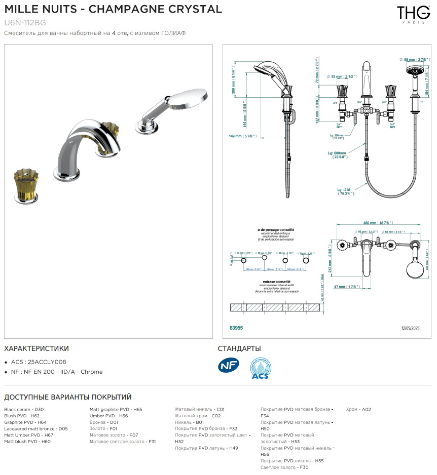 Смеситель для ванны THG Mille Nuits - Champagne crystal набортный на 4 отв. с изливом ГОЛИАФ