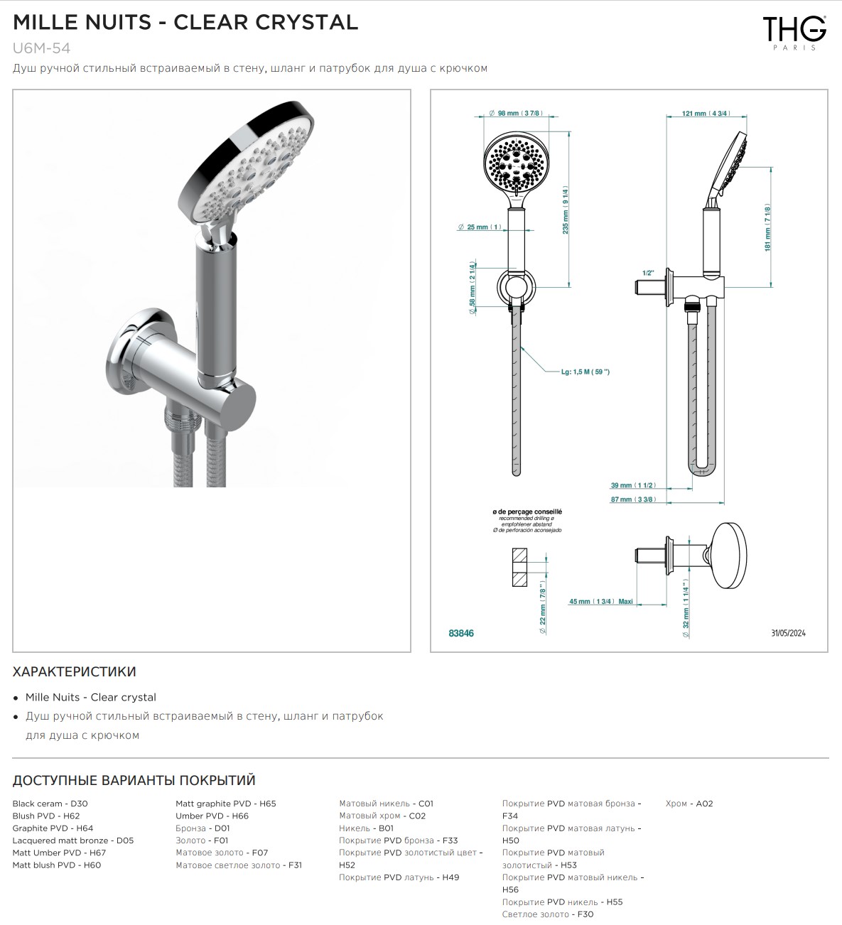 Душ ручной THG Mille Nuits - Clear crystal стильный встраиваемый в стену, шланг и патрубок для душа с крючком