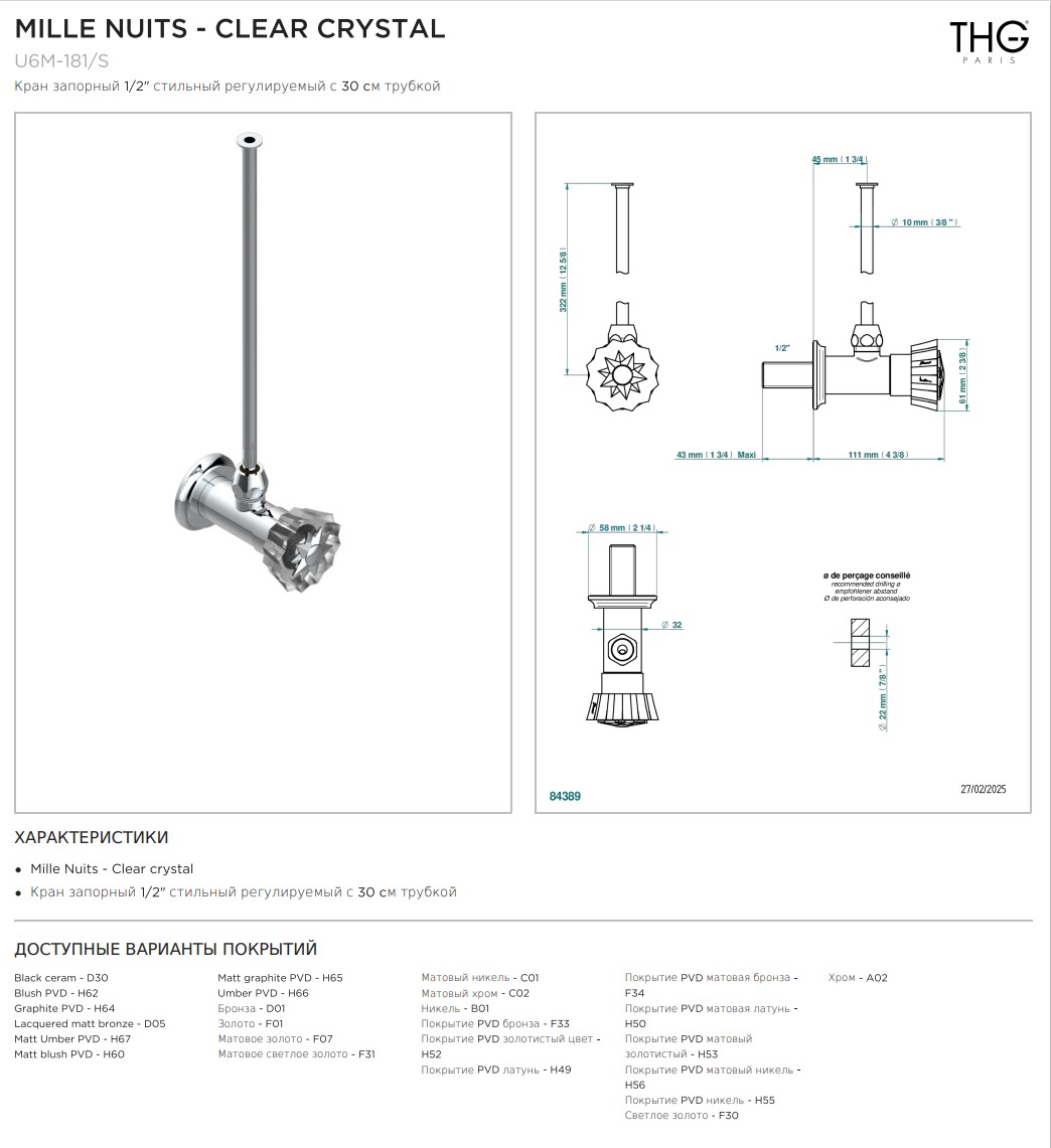 Кран запорный THG Mille Nuits - Clear crystal 1/2" стильный регулируемый с 30 cм трубкой коллекции Смесители THG Mille Nuits - Clear crystal можно купить по розничной цене в нашем шоу-руме в Москве по адресу ул. Дениса Давыдова, д. 4 или через наш интернет-магазин StudioArdo.