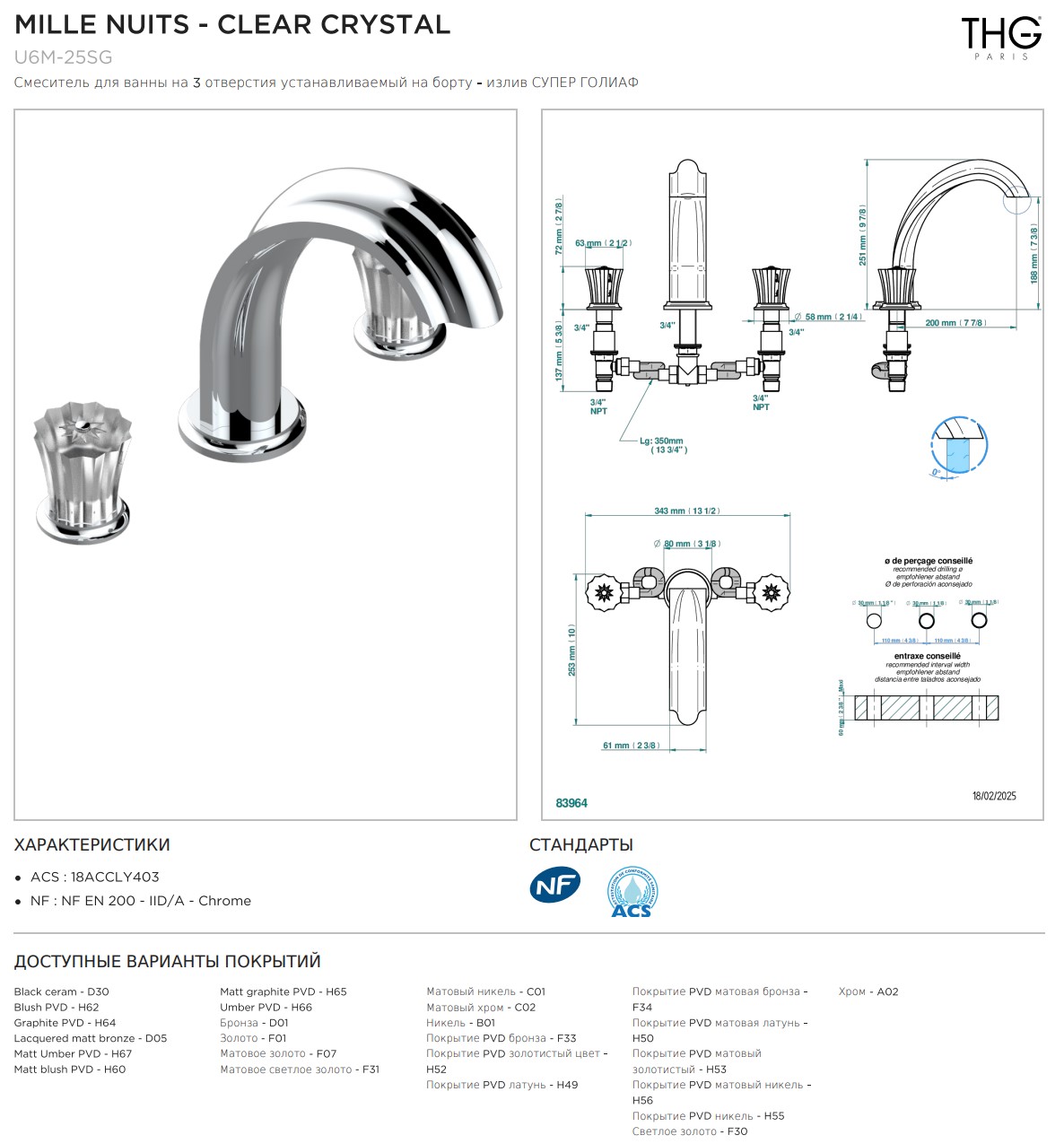 Смеситель для ванны THG Mille Nuits - Clear crystal на 3 отверстия устанавливаемый на борту - излив СУПЕР ГОЛИАФ