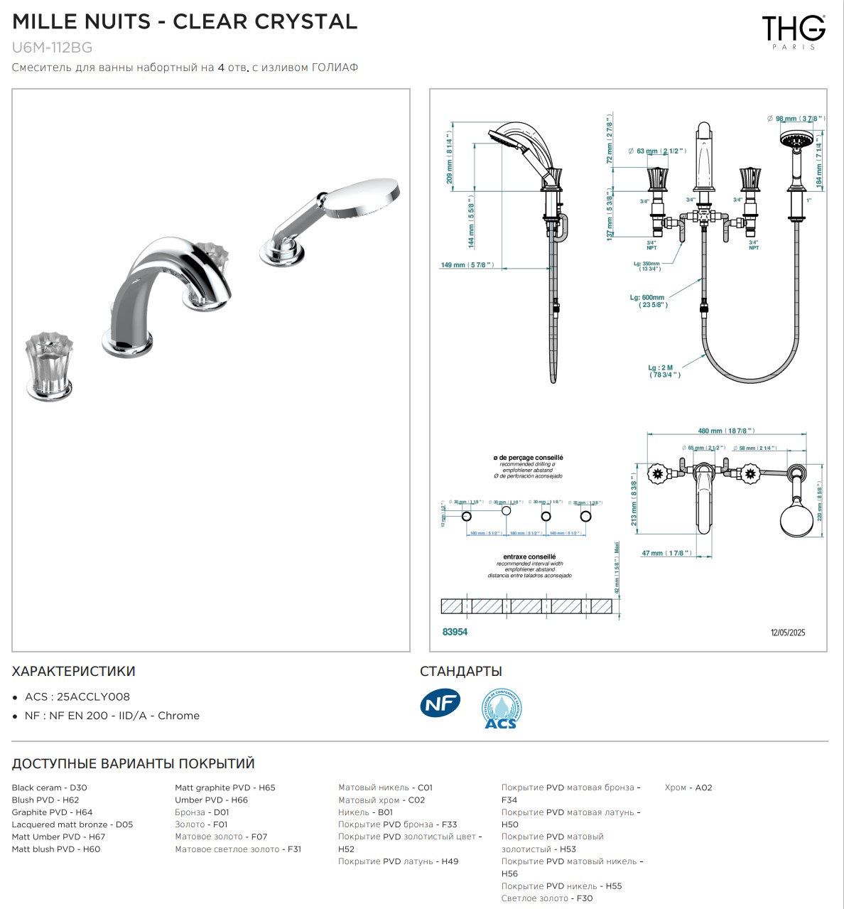 Смеситель для ванны THG Mille Nuits - Clear crystal набортный на 4 отв. с изливом ГОЛИАФ