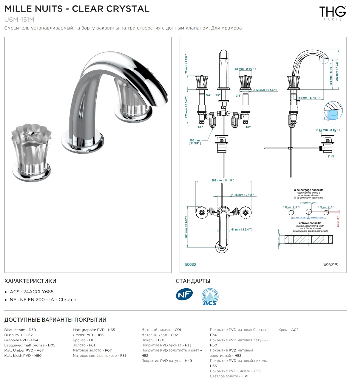 Смеситель устанавливаемый на борту раковины THG Mille Nuits - Clear crystal на три отверстия с донным клапаном. Для мрамора