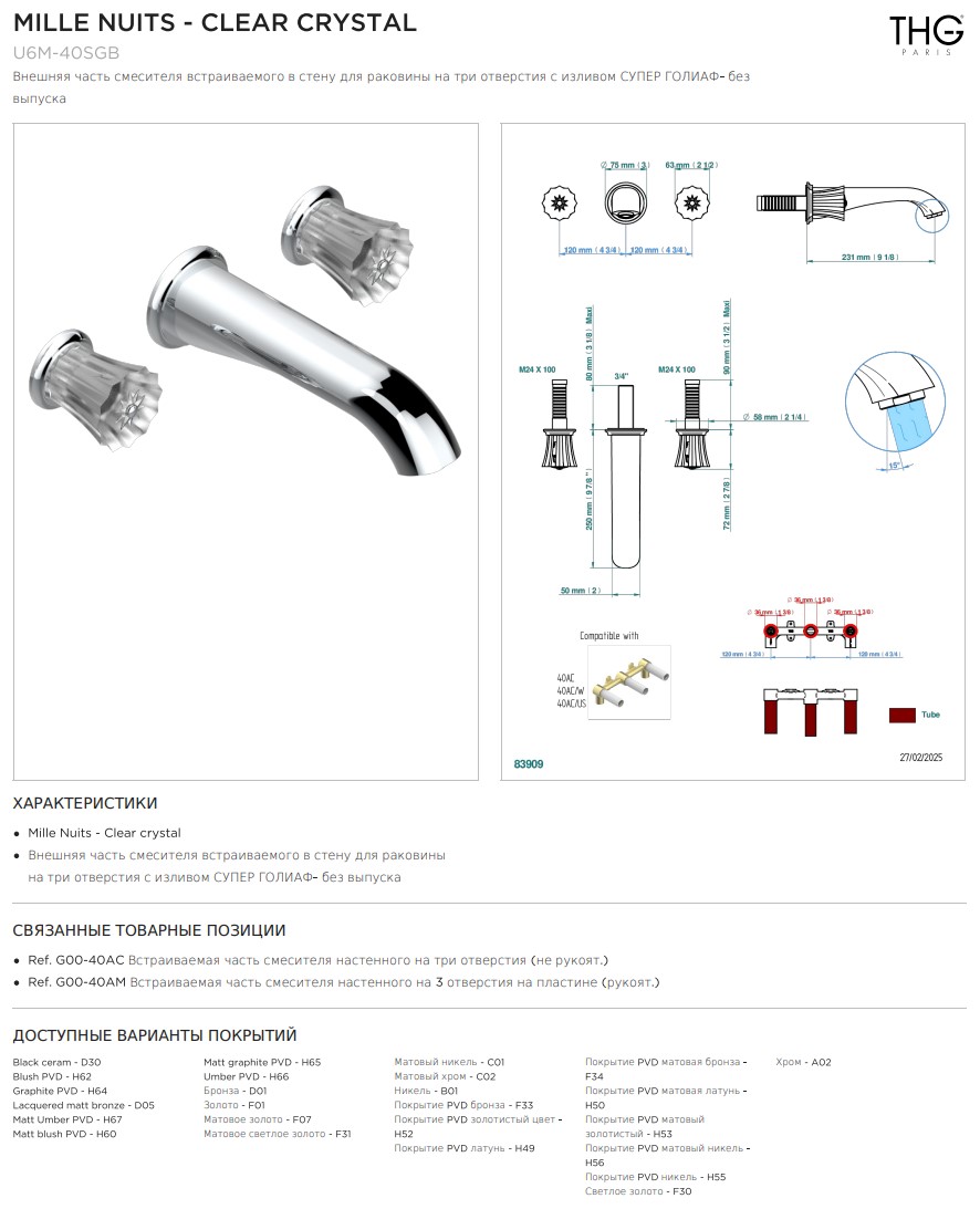 Внешняя часть смесителя THG Mille Nuits - Clear crystal встраиваемого в стену для раковины на три отверстия с изливом СУПЕР ГОЛИАФ- без выпуска