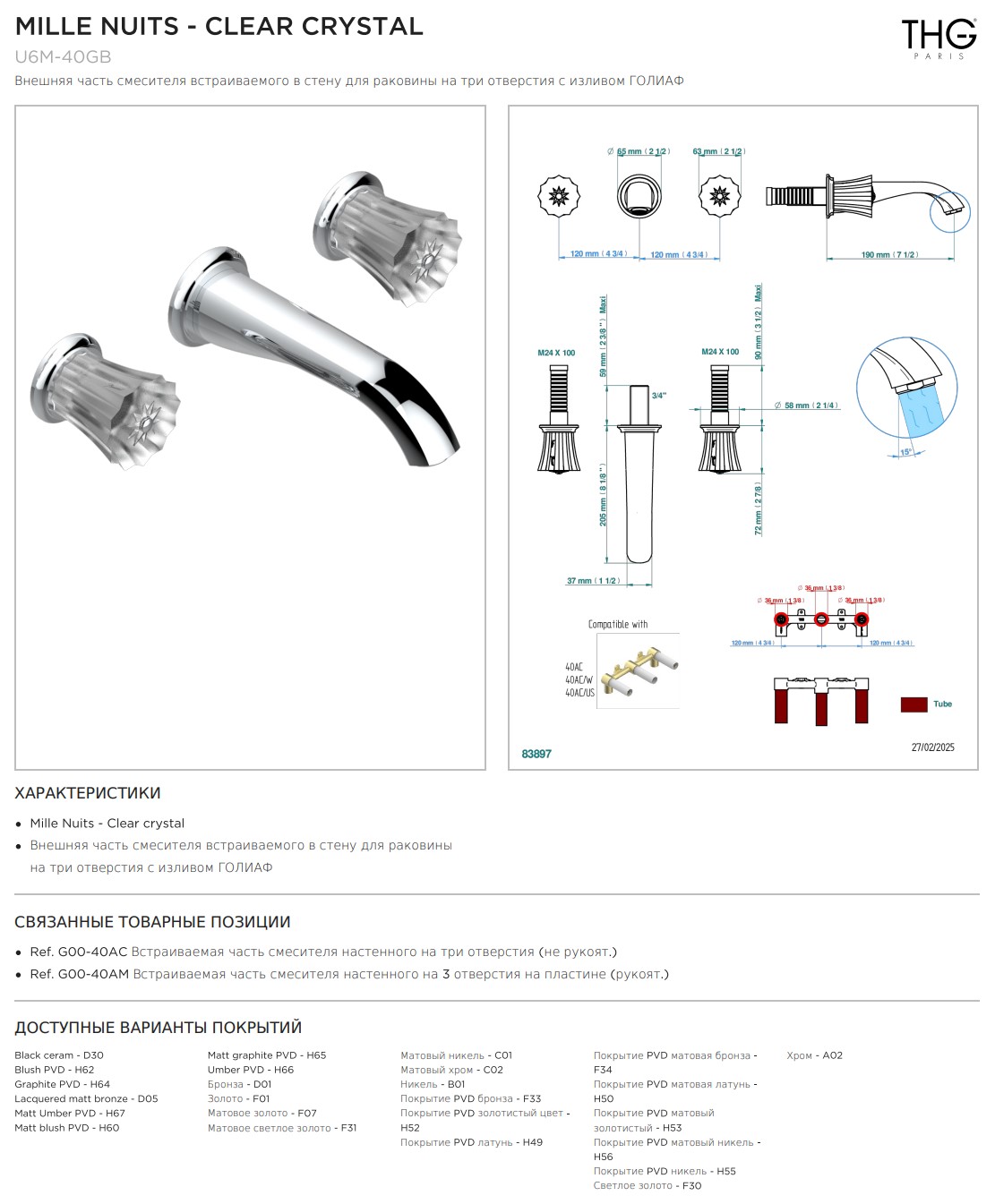 Внешняя часть смесителя THG Mille Nuits - Clear crystal встраиваемого в стену для раковины на три отверстия с изливом ГОЛИАФ коллекции Смесители THG Mille Nuits - Clear crystal можно купить по розничной цене в нашем шоу-руме в Москве по адресу ул. Дениса Давыдова, д. 4 или через наш интернет-магазин StudioArdo.