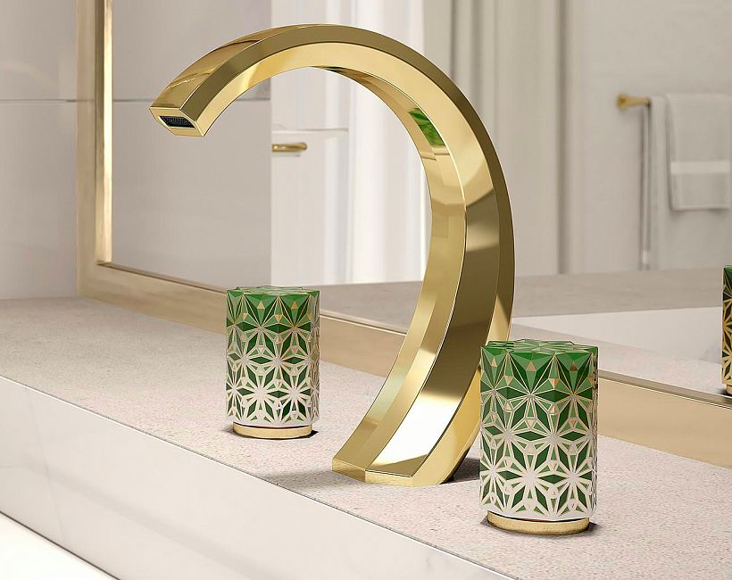 THG Nihal Porcelaine Verte Смеситель для раковины на 3 отверстия, с донным клапаном, цвет: Soft gold коллекции Смесители THG Nihal Porcelaine Verte можно купить по розничной цене в нашем шоу-руме в Москве по адресу ул. Дениса Давыдова, д. 4 или через наш интернет-магазин StudioArdo.