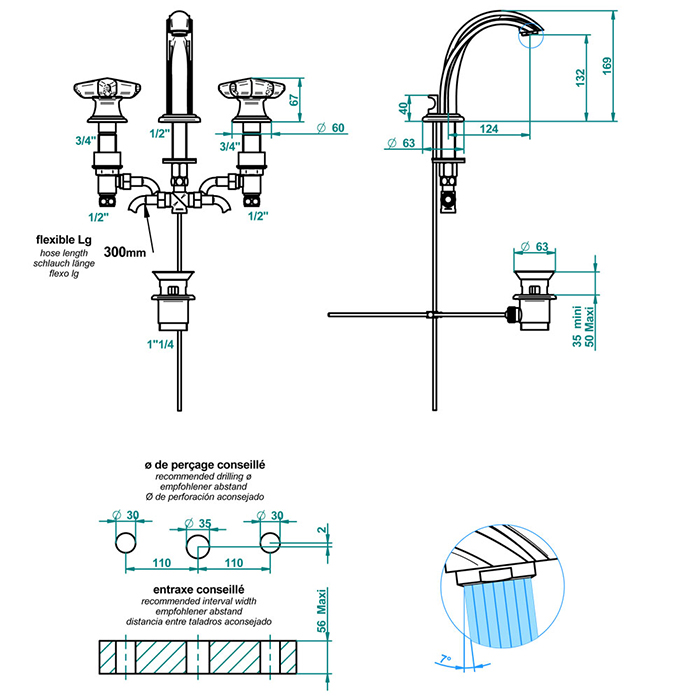 THG Oceania Смеситель для раковины, 3 отв., цвет: золото/прозрачный хрусталь