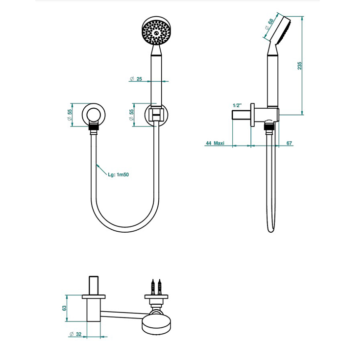 THG Paradise Душевой комплект с ручным душем, шланг 1500 мм., держатель и подвод воды, цвет: хром