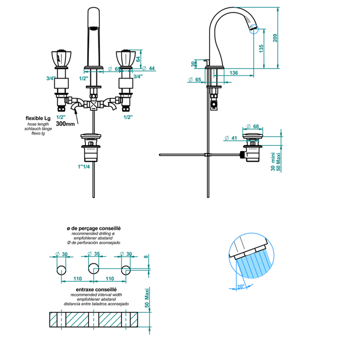 THG Pуtale de cristal bleu Смеситель для раковины, 3 отв., цвет: золото/синий хрусталь