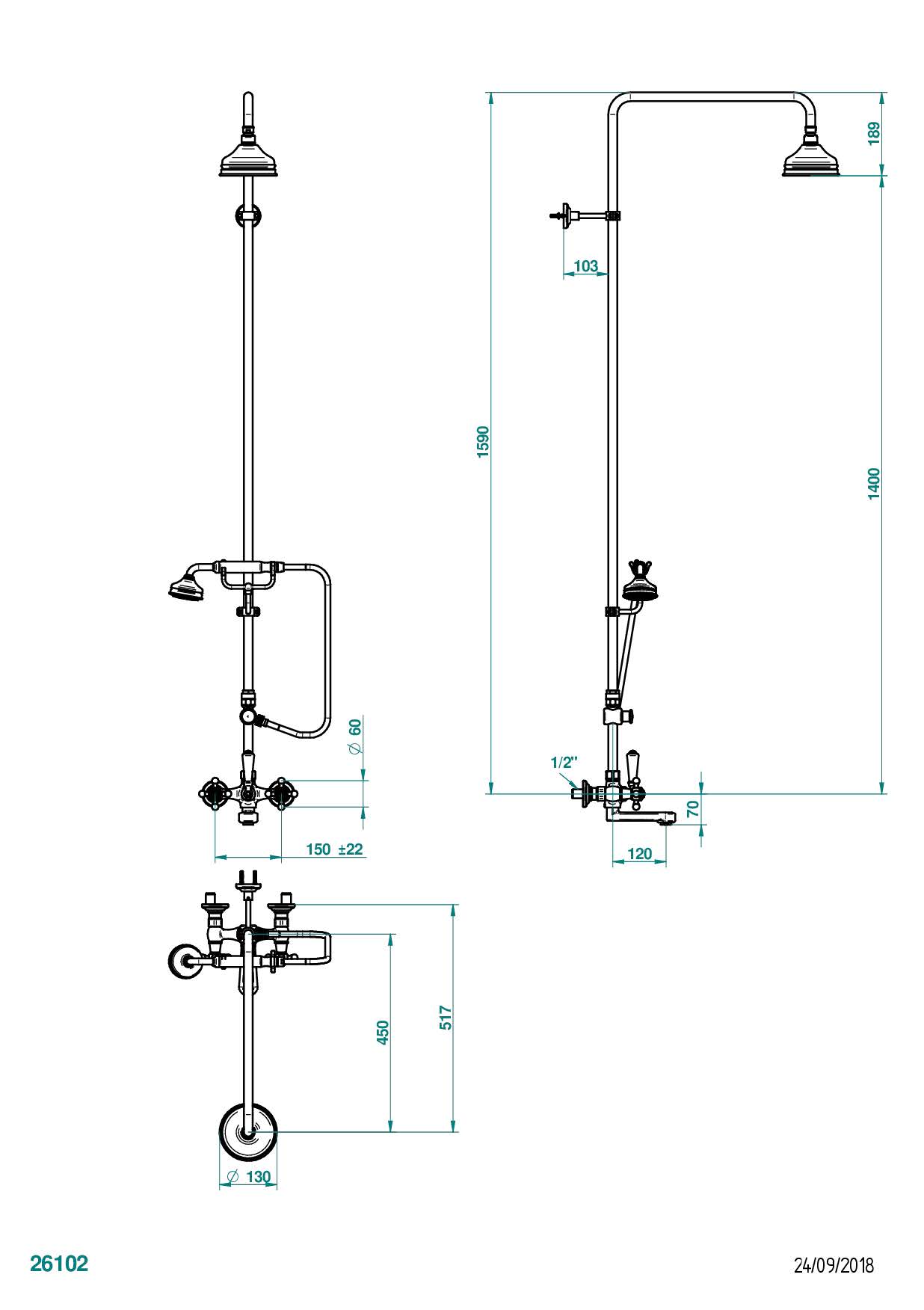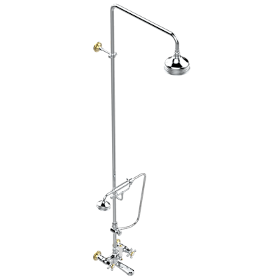 Смеситель THG Charleston настенный для ванны/душа 1/2" с расстоянием между вентилями 150 мм (+ или - 22 мм), с душевой колонной с переключателем, настенной скобой, ручным душем, шлангом 1.5 м, держателем на стержне и 120 мм верхним душем коллекции Смесители THG Charleston можно купить по розничной цене в нашем шоу-руме в Москве по адресу ул. Дениса Давыдова, д. 4 или через наш интернет-магазин StudioArdo.