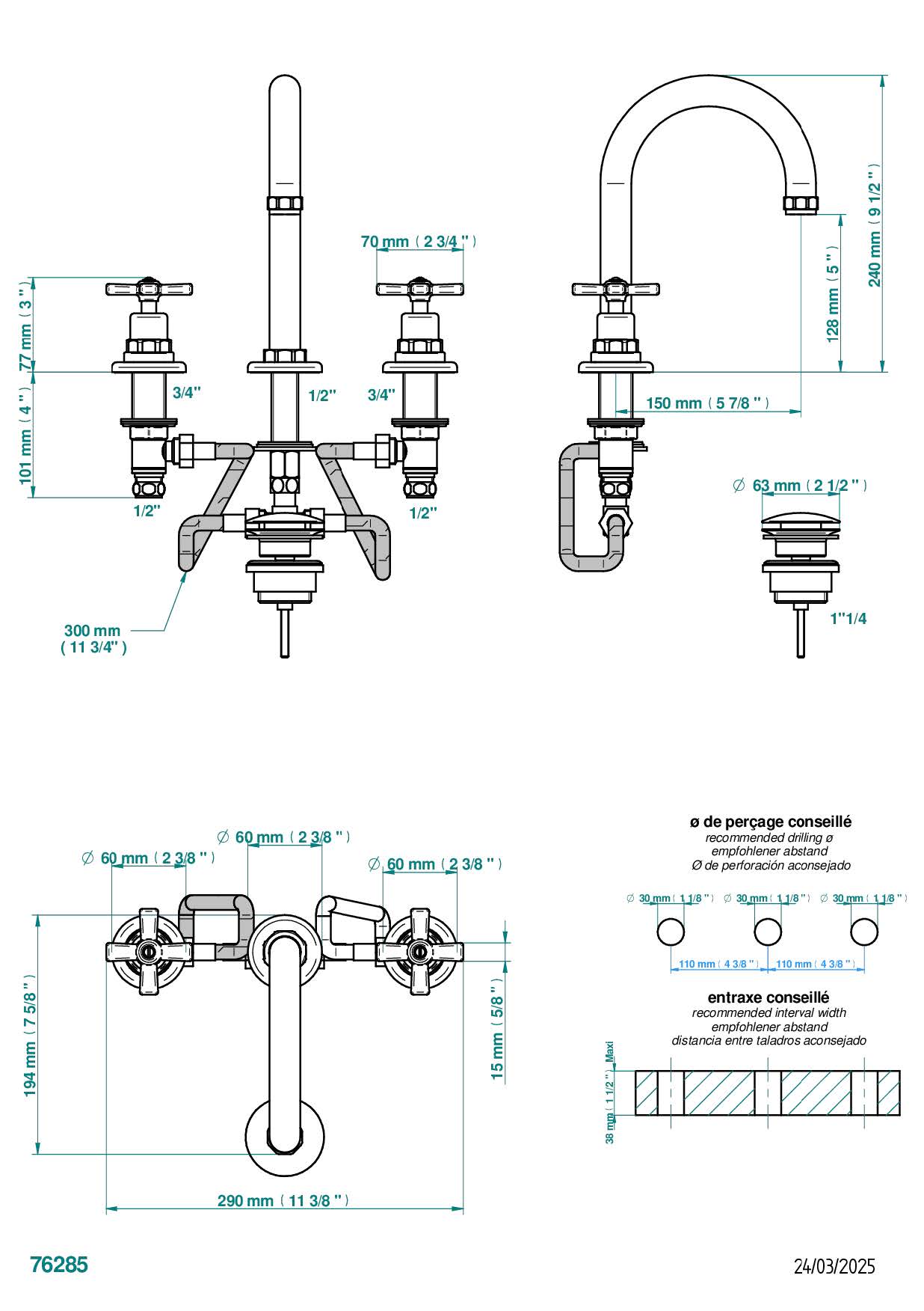 Смеситель для раковины THG Club Saint-Germain на три отверстия устанавливаемый на борту с донным клапаном