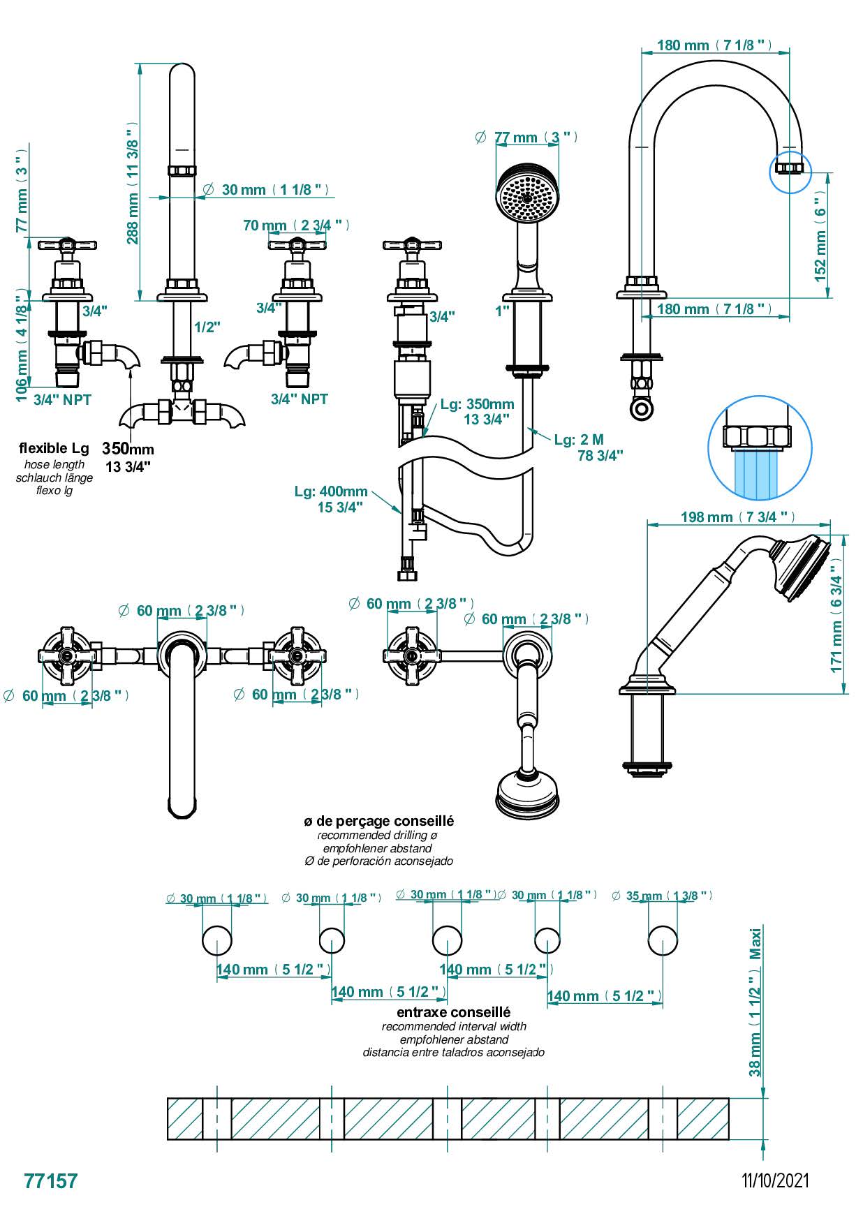 Смеситель THG Club Saint-Germain на борт ванны на 5 отверстий с душем, керамическим смесителем, 2 вентилями ¾" и изливом СУПЕР ГОЛИАФ