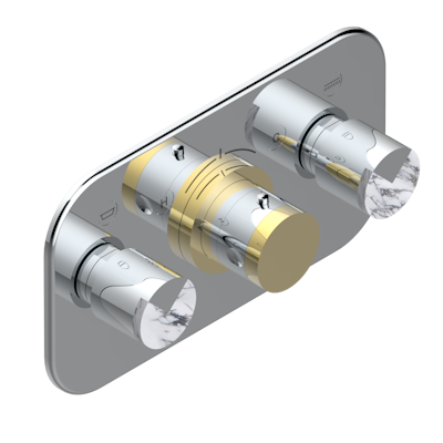 Накладка THG Le 9 Howlite с ручкой регулировки температуры и двумя маховиками для термостатического смесителя с горизонтальной установкой коллекции Смесители THG Le 9 Howlite можно купить по розничной цене в нашем шоу-руме в Москве по адресу ул. Дениса Давыдова, д. 4 или через наш интернет-магазин StudioArdo.