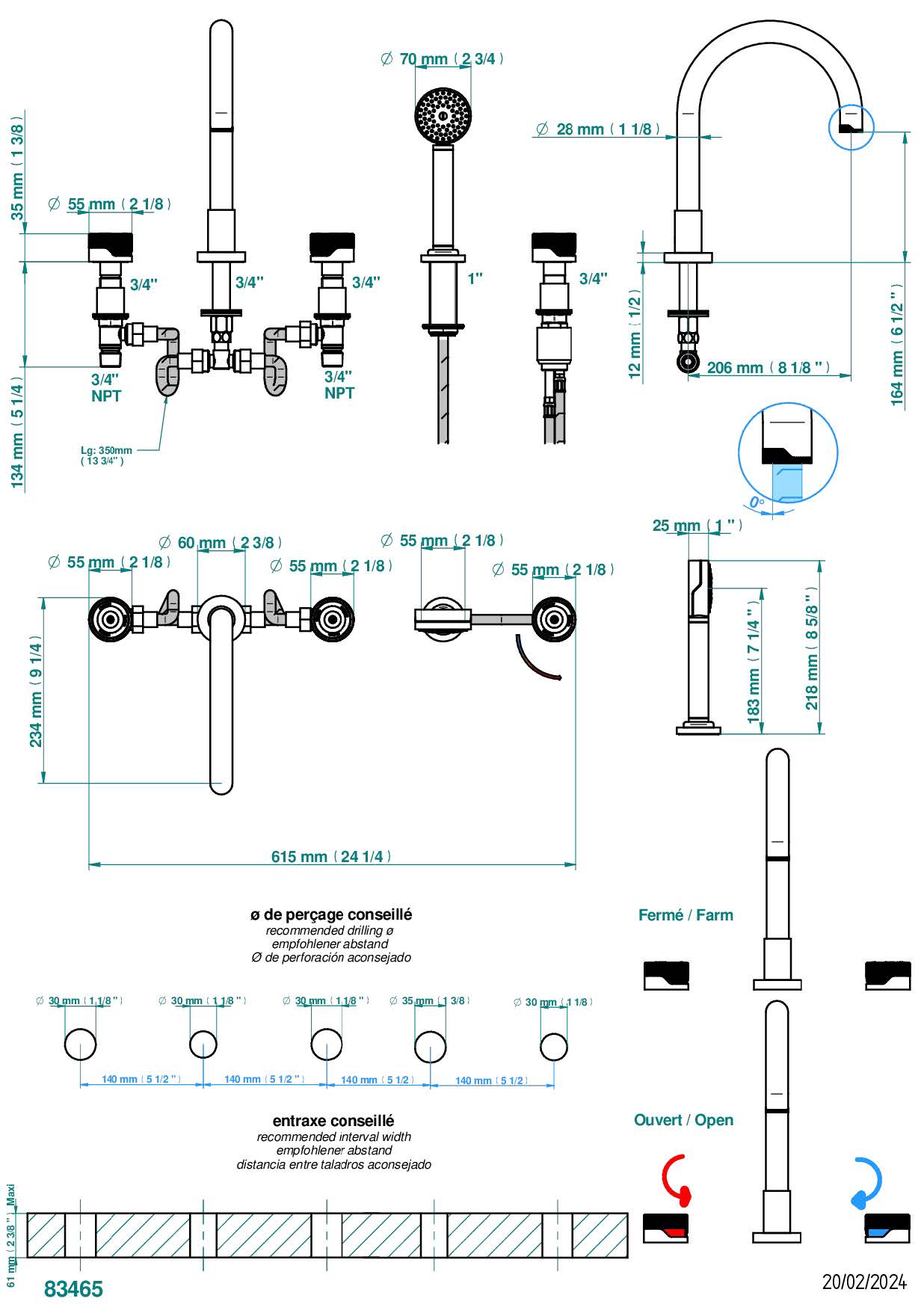 Смеситель THG Zoom.5 для ванны, 5-рычажный с очень высоким изливом «Super Goliath», 2 клапана 3/4", и накладным душем-лейкой, управляемый прогрессивным картриджем