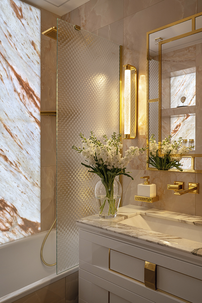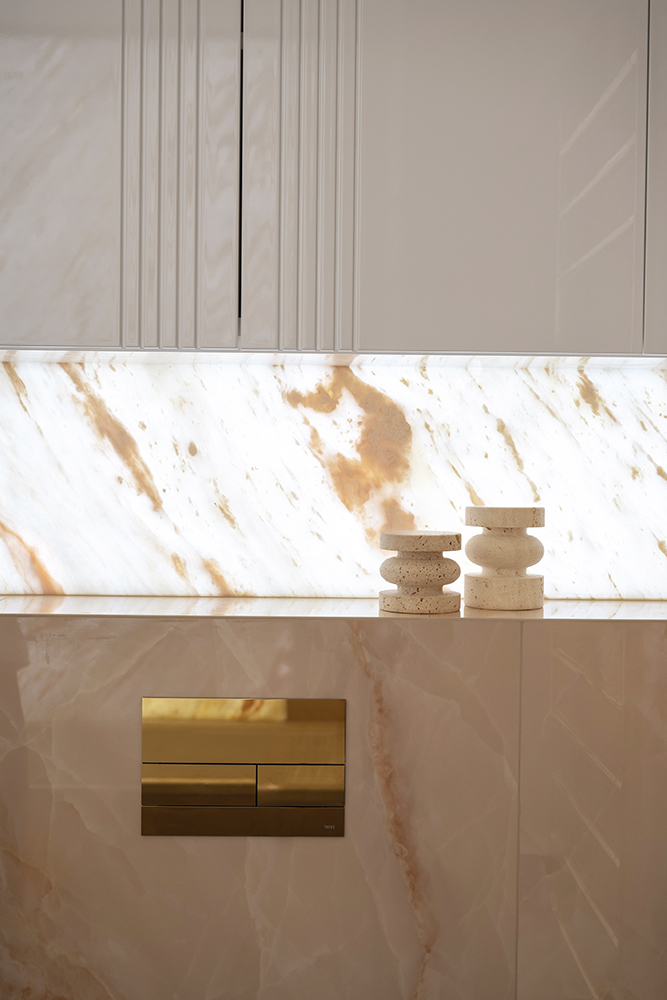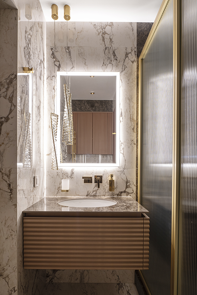 В рамках работ ARDO выполнили полировку натурального камня, фрезеровку под латунный профиль на мраморе, монтаж керамогранита и плинтусов, а также резку мозаики — чтобы все поверхности читались цельно, а детали выглядели действительно премиально.