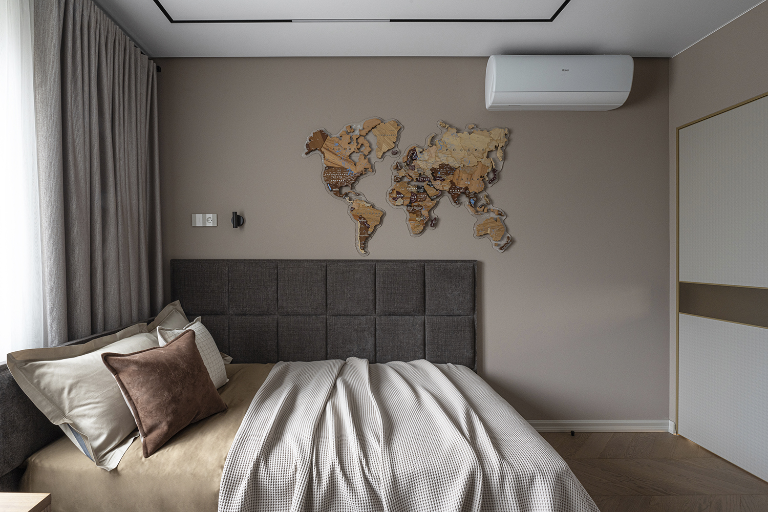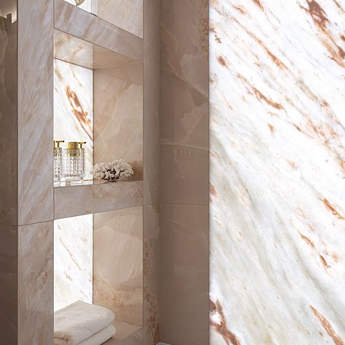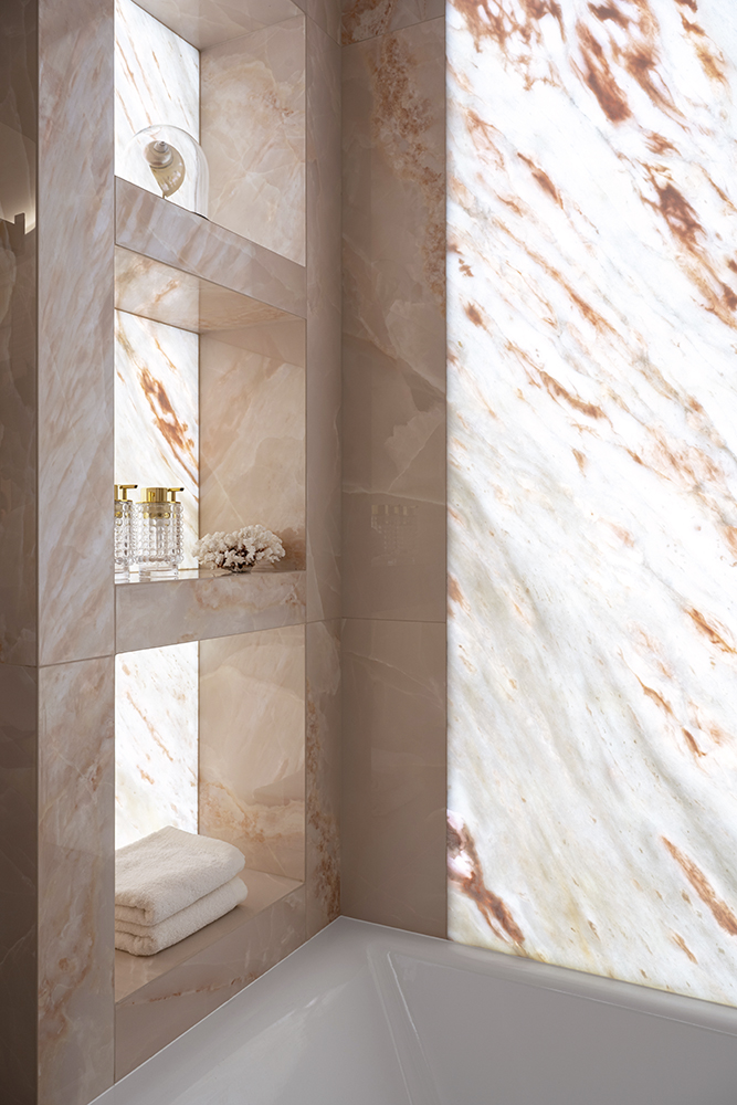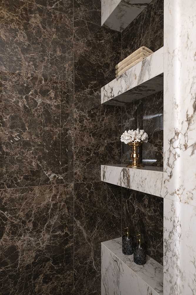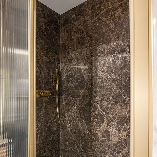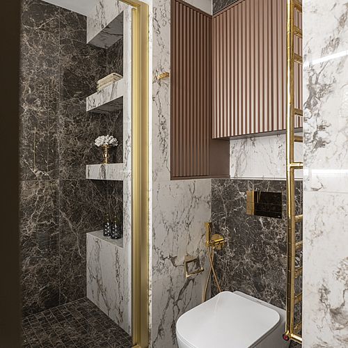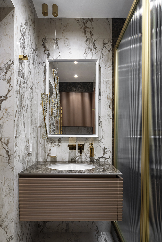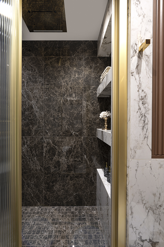В мастер-санузле акцентом выступает экран с подсветкой из мрамора Роза Намибия, а стены отделаны керамогранитом Emil Ceramica Tele Di Marmo Onix Pink — материалом с мягкой каменной глубиной и благородной световой игрой. В гостевом санузле стены и пол выполнены из керамогранита Keope Interno4 Breccia Tortona, который собирает пространство в цельный “каменный объём”. В душевой стены оформлены керамогранитом Rex Les Bijoux De Rex Marron Imperial (Glossy), а на полу — мозаика, выполненная резкой из этого же керамогранита, чтобы сохранить единый рисунок и цвет.