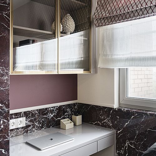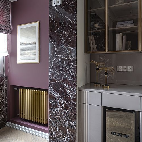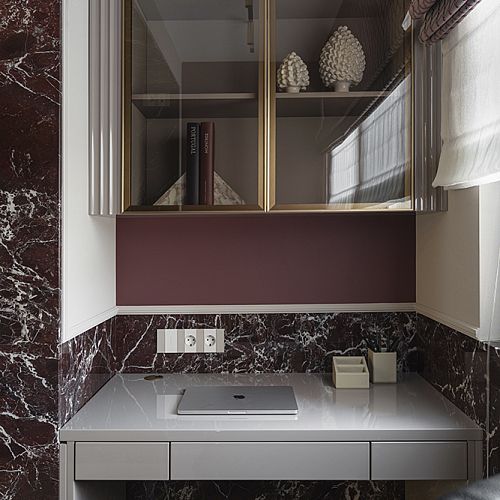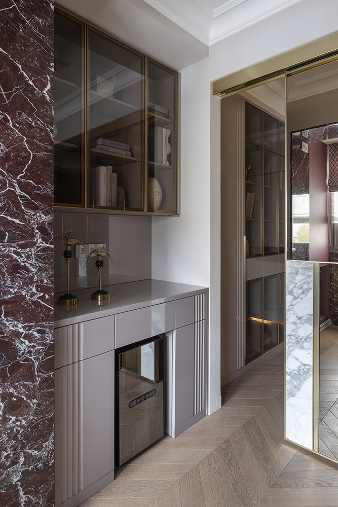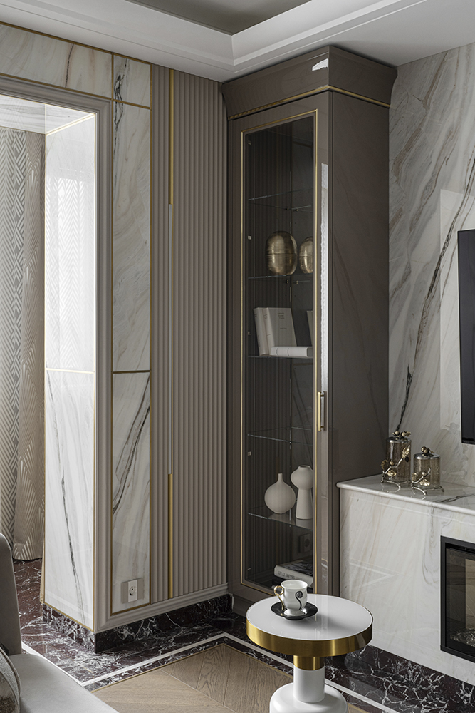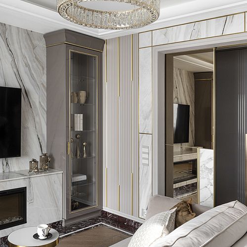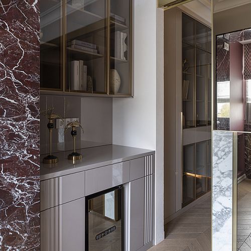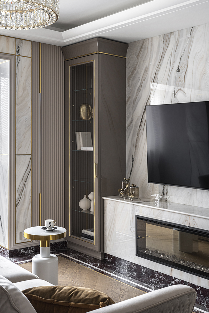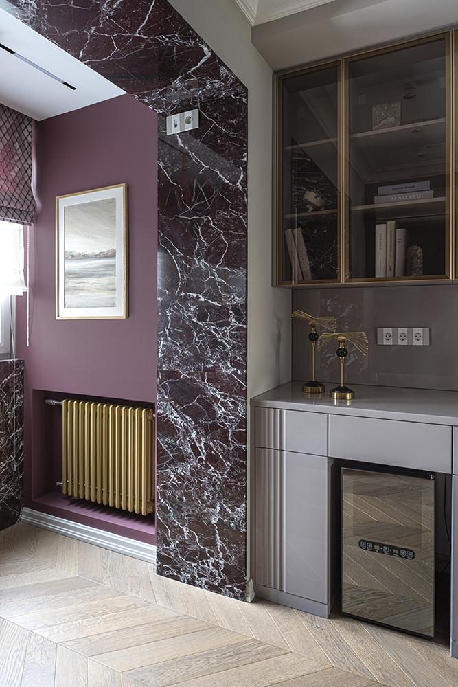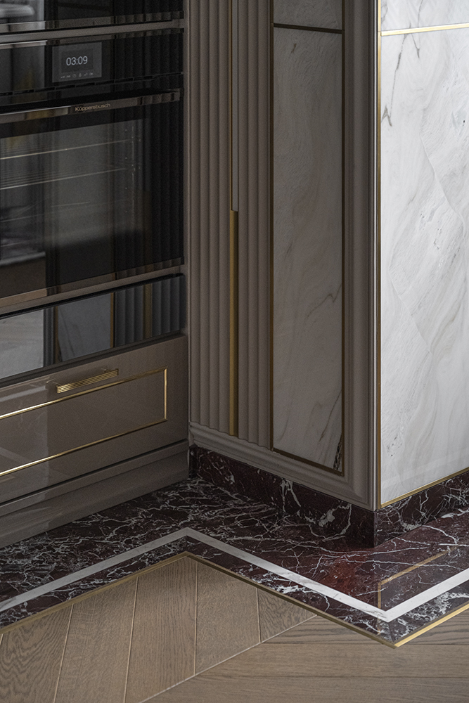 В гостиной, кабинете и зоне кухни использован натуральный мрамор Россо Леванте — выразительный камень, который задаёт тон всему интерьеру. Архитектурную графику пространства поддерживают молдинги Orac Decor, а камень смонтирован командой ARDO с вниманием к стыкам и примыканиям. Отдельный акцент гостиной — портал из натурального мрамора Бьянка Лаза, который работает как статусный центр композиции.