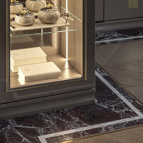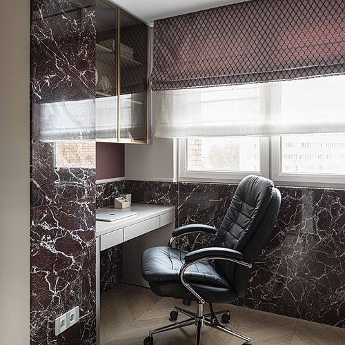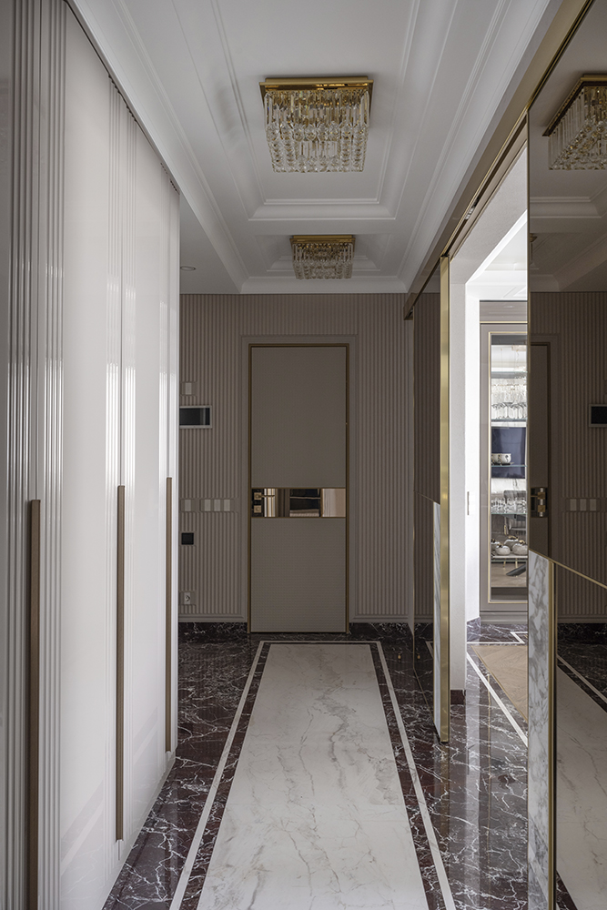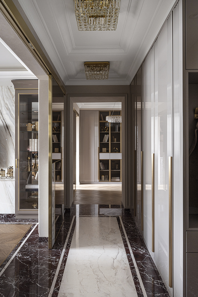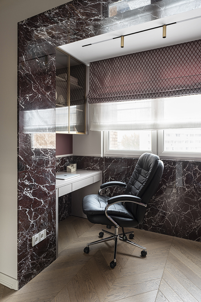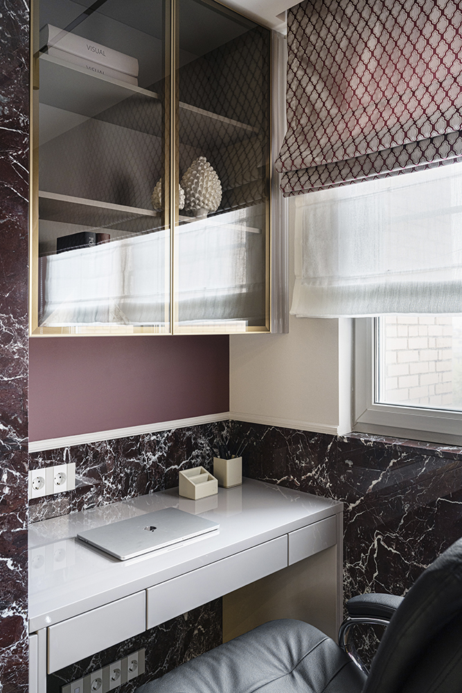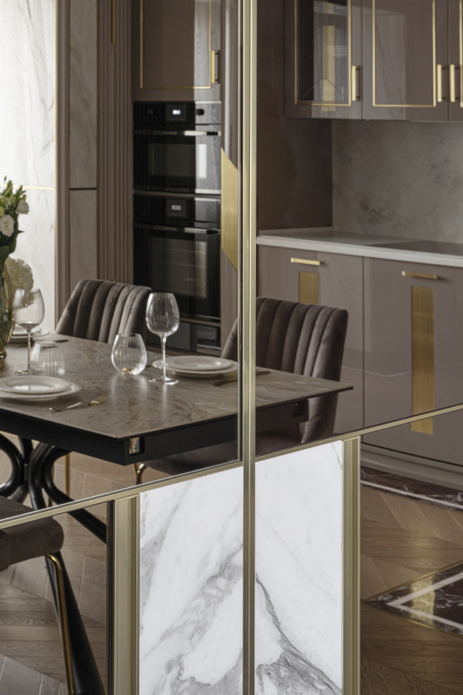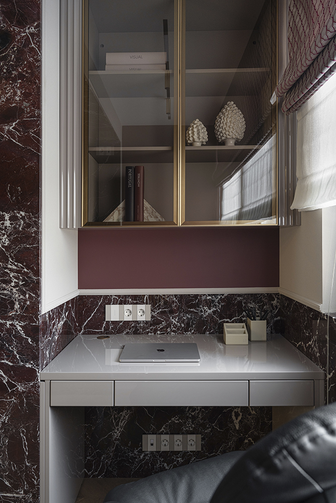 В гостиной, кабинете и зоне кухни использован натуральный мрамор Россо Леванте — выразительный камень, который задаёт тон всему интерьеру. Архитектурную графику пространства поддерживают молдинги Orac Decor, а камень смонтирован командой ARDO с вниманием к стыкам и примыканиям. Отдельный акцент гостиной — портал из натурального мрамора Бьянка Лаза, который работает как статусный центр композиции.