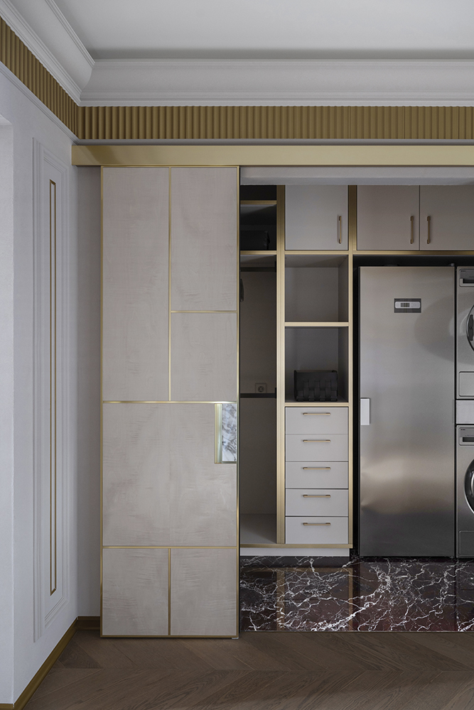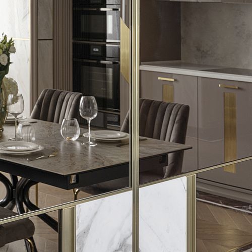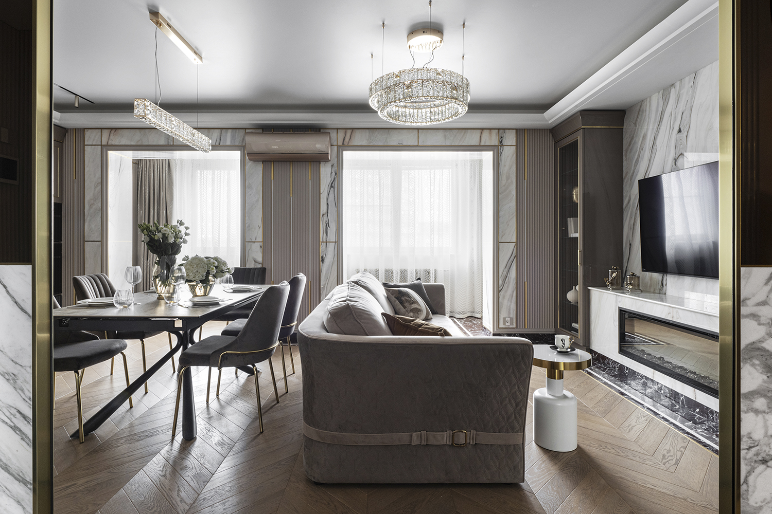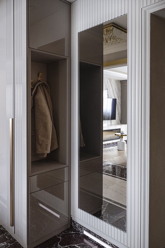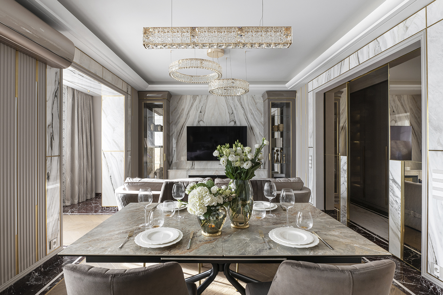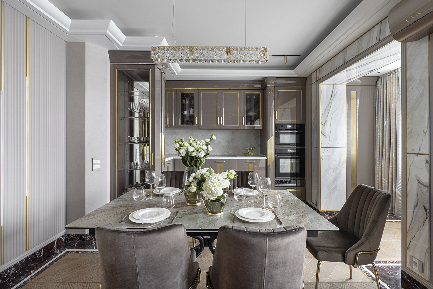 В гостиной, кабинете и зоне кухни использован натуральный мрамор Россо Леванте — выразительный камень, который задаёт тон всему интерьеру. Архитектурную графику пространства поддерживают молдинги Orac Decor, а камень смонтирован командой ARDO с вниманием к стыкам и примыканиям. Отдельный акцент гостиной — портал из натурального мрамора Бьянка Лаза, который работает как статусный центр композиции.