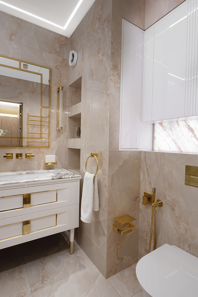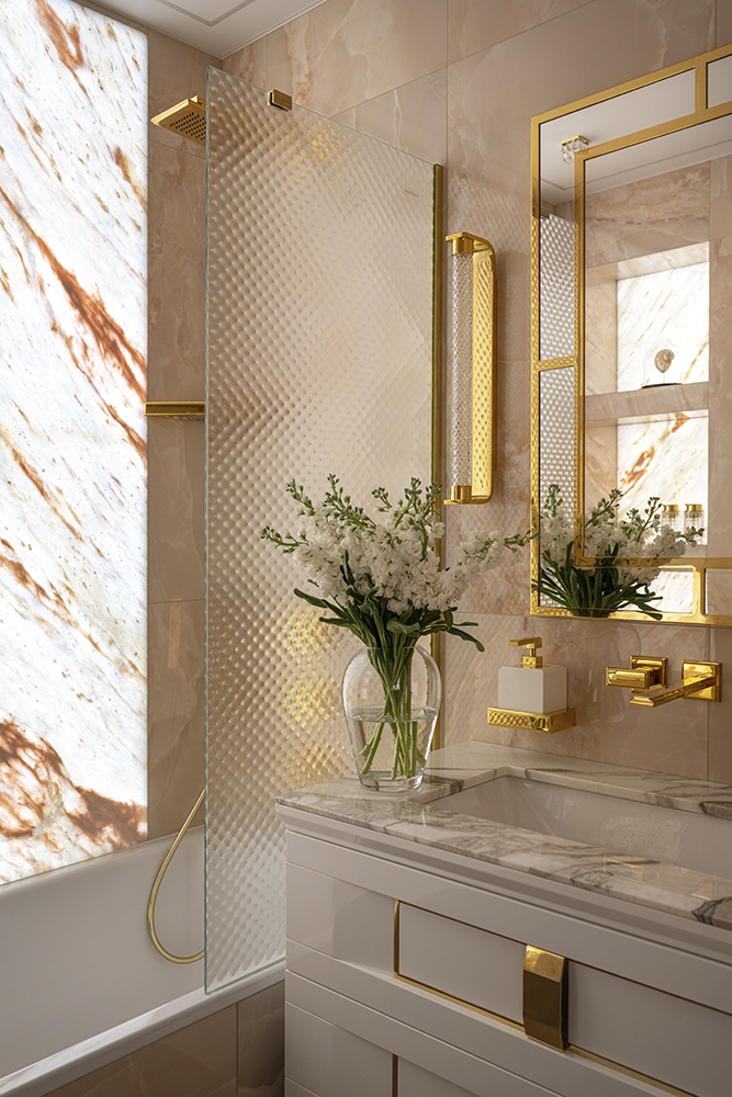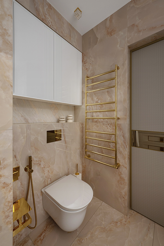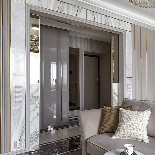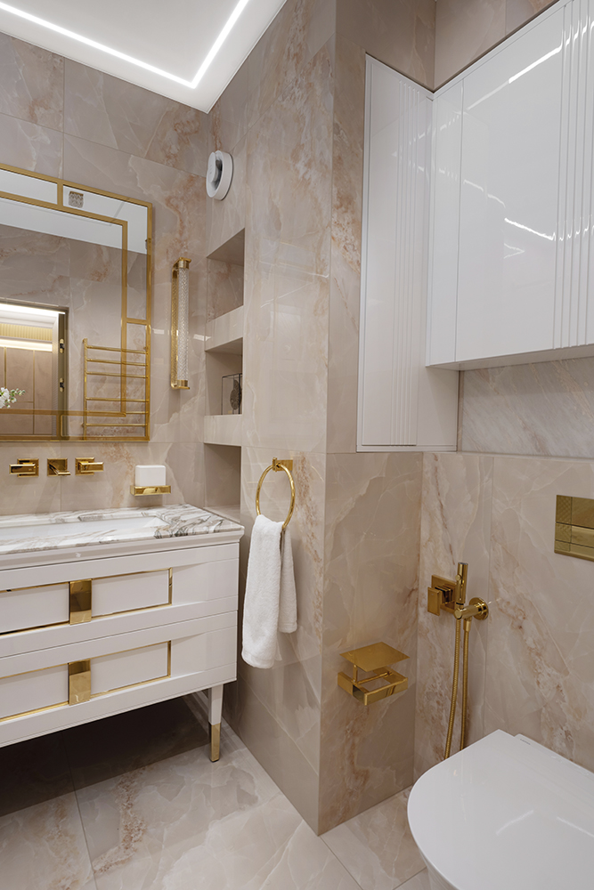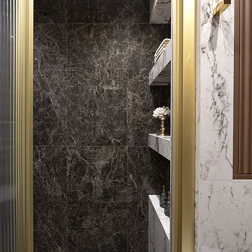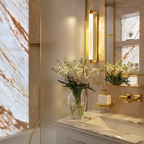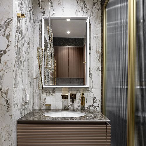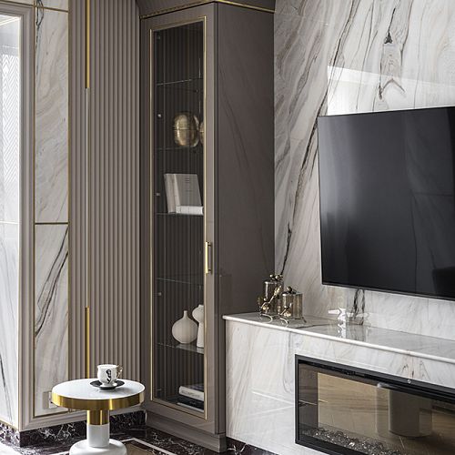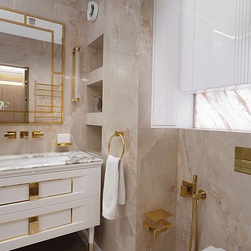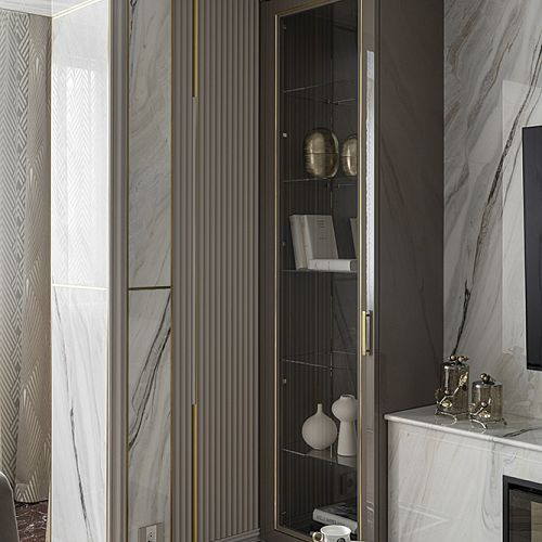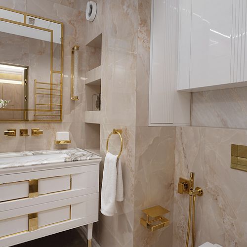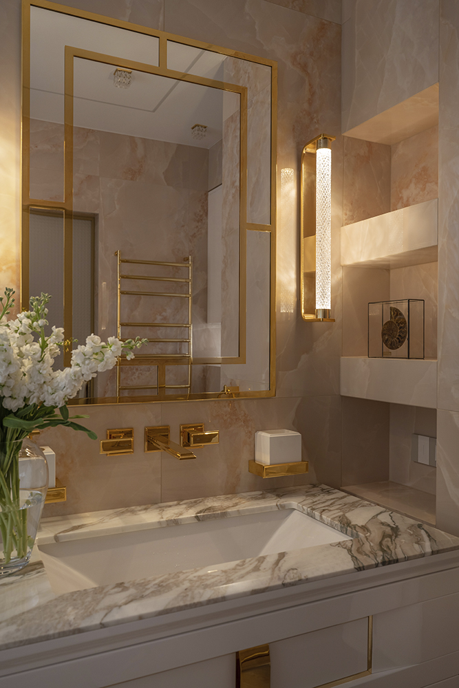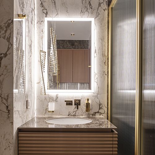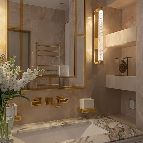 Проект студии Olland (Ольга и Андрей Власовы) — современный арт-деко, где роскошь читается через натуральный камень, чистую геометрию и точные акценты. В санузлах эту идею продолжает керамогранит с эстетикой камня — с глубиной рисунка и благородной игрой света. Монтаж и ключевые узлы выполнены ARDO, чтобы материал выглядел цельно и служил без компромиссов.