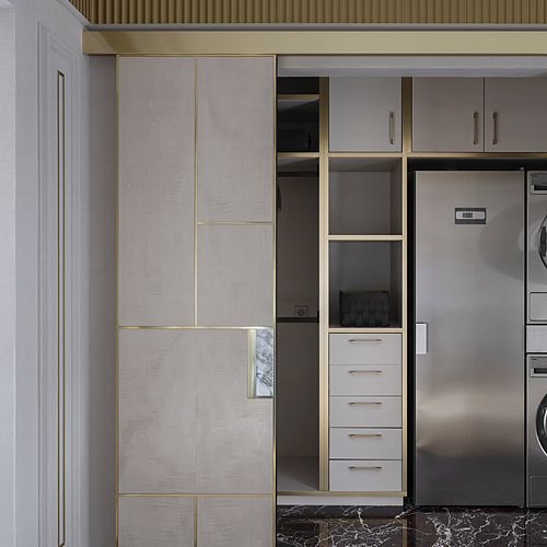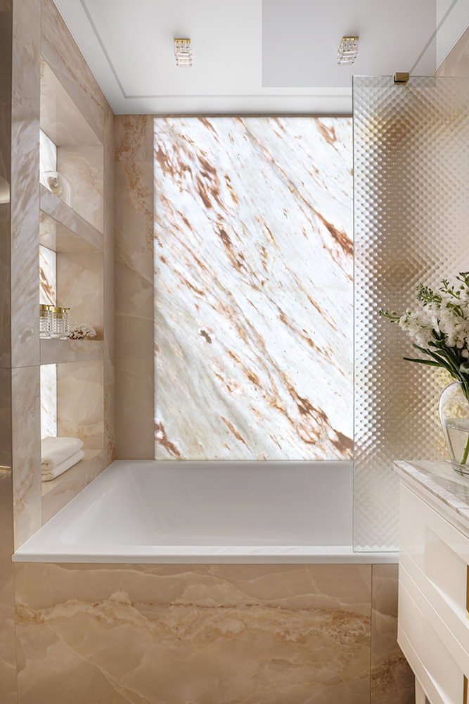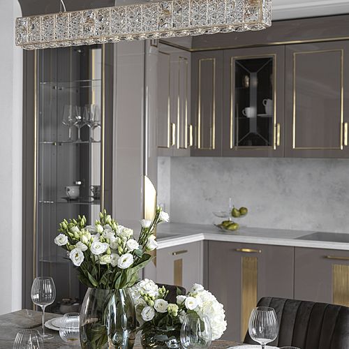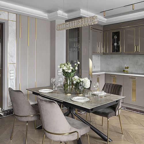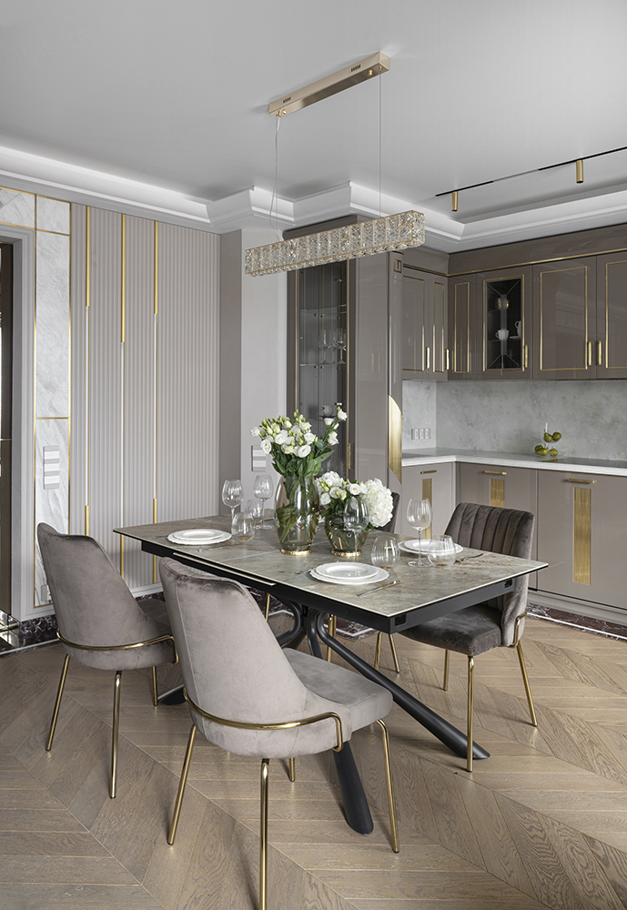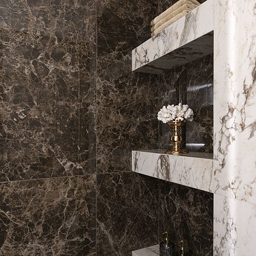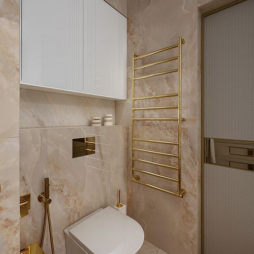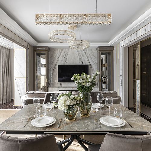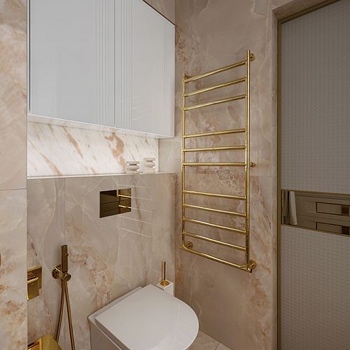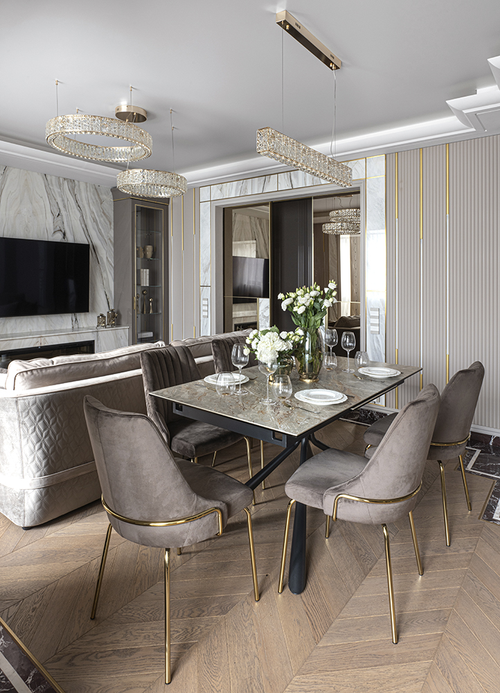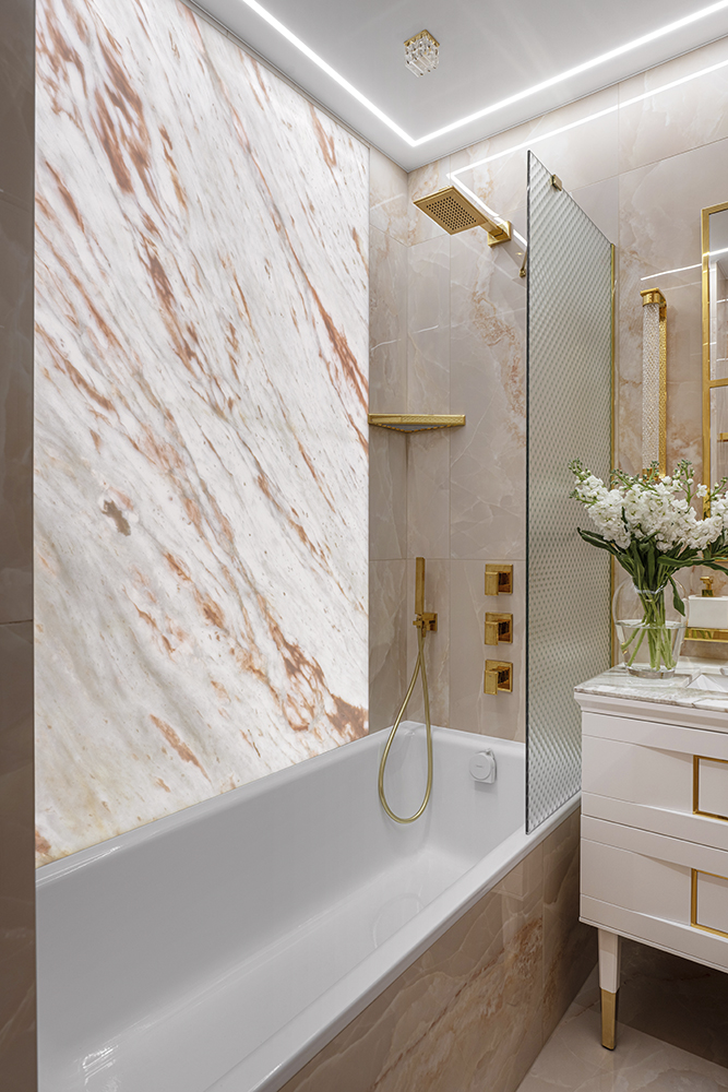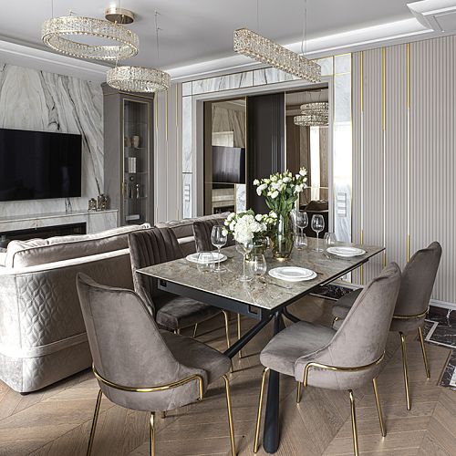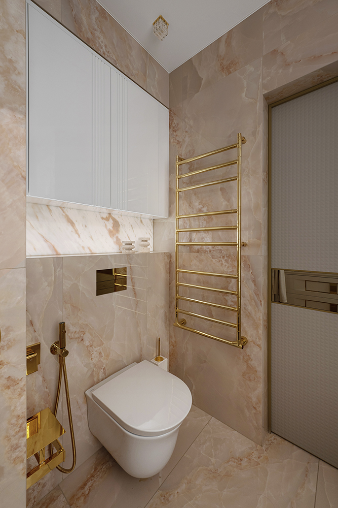 Проект студии Olland (Ольга и Андрей Власовы) — современный арт-деко, где роскошь читается через натуральный камень, чистую геометрию и точные акценты. В санузлах эту идею продолжает керамогранит с эстетикой камня — с глубиной рисунка и благородной игрой света. Монтаж и ключевые узлы выполнены ARDO, чтобы материал выглядел цельно и служил без компромиссов.
