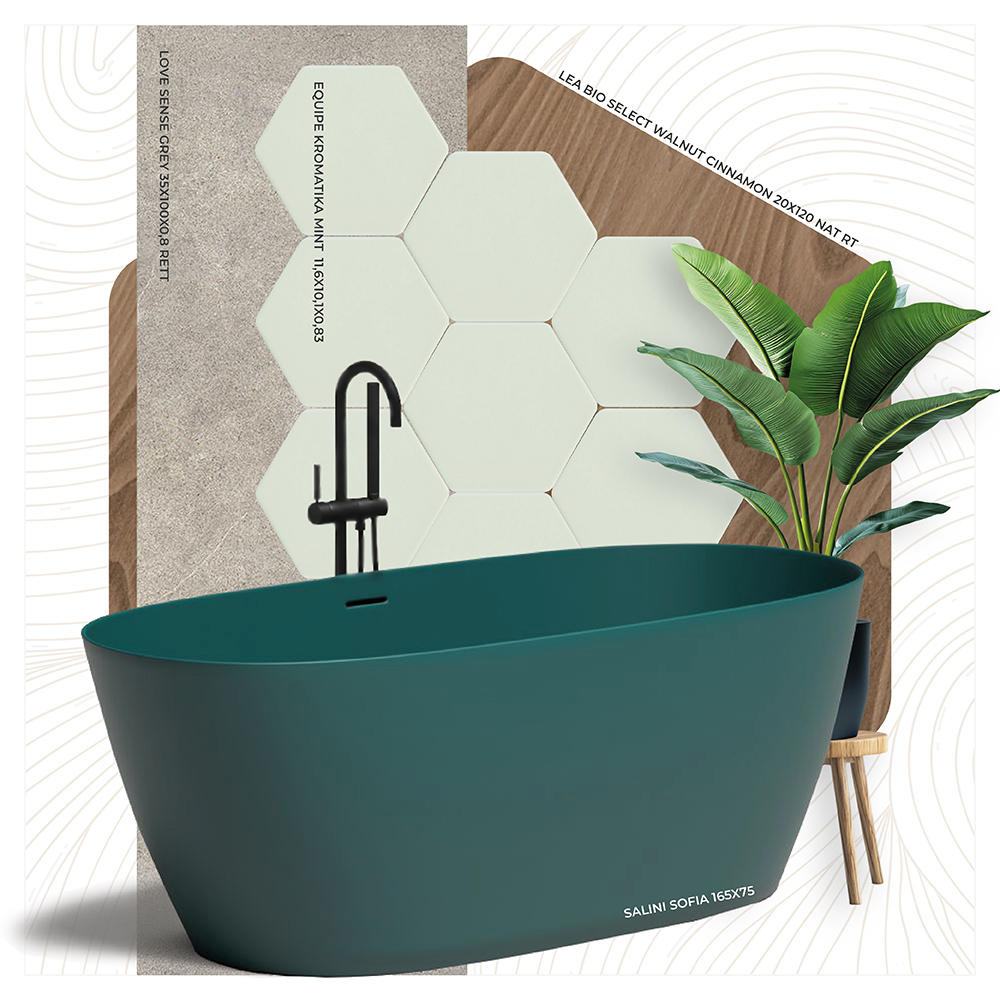 Коллаж с плиткой Equipe, Lea и ванной Salini