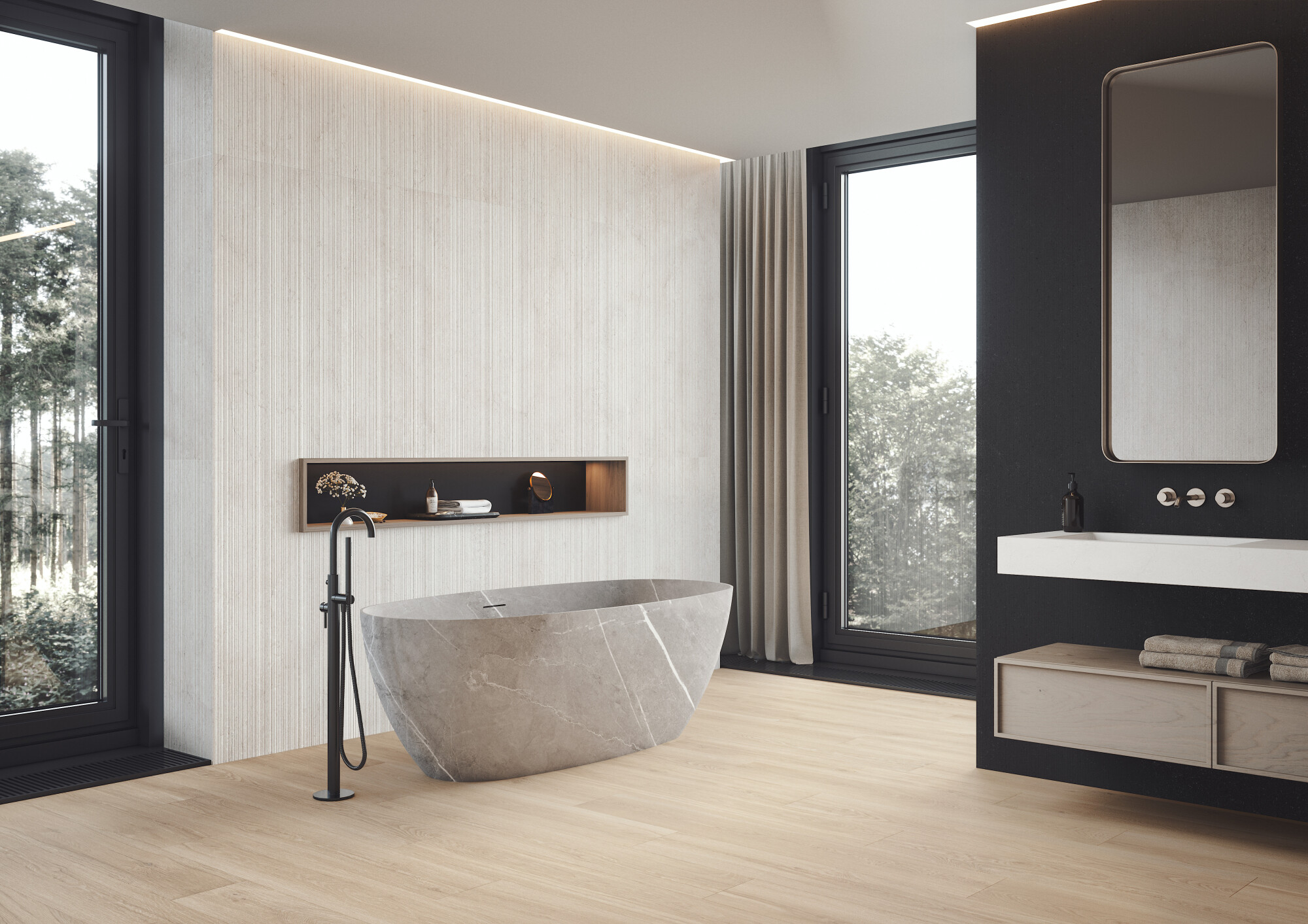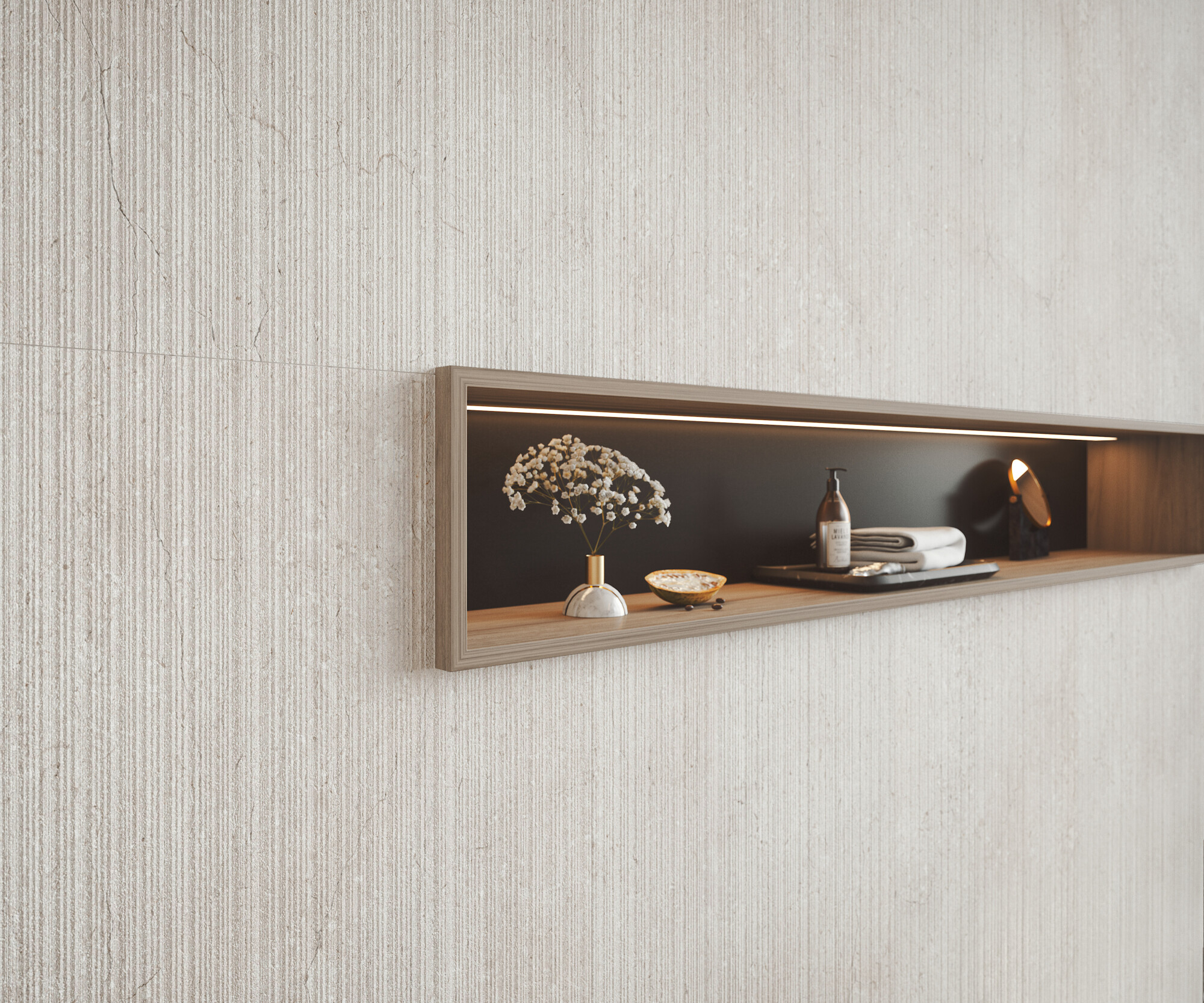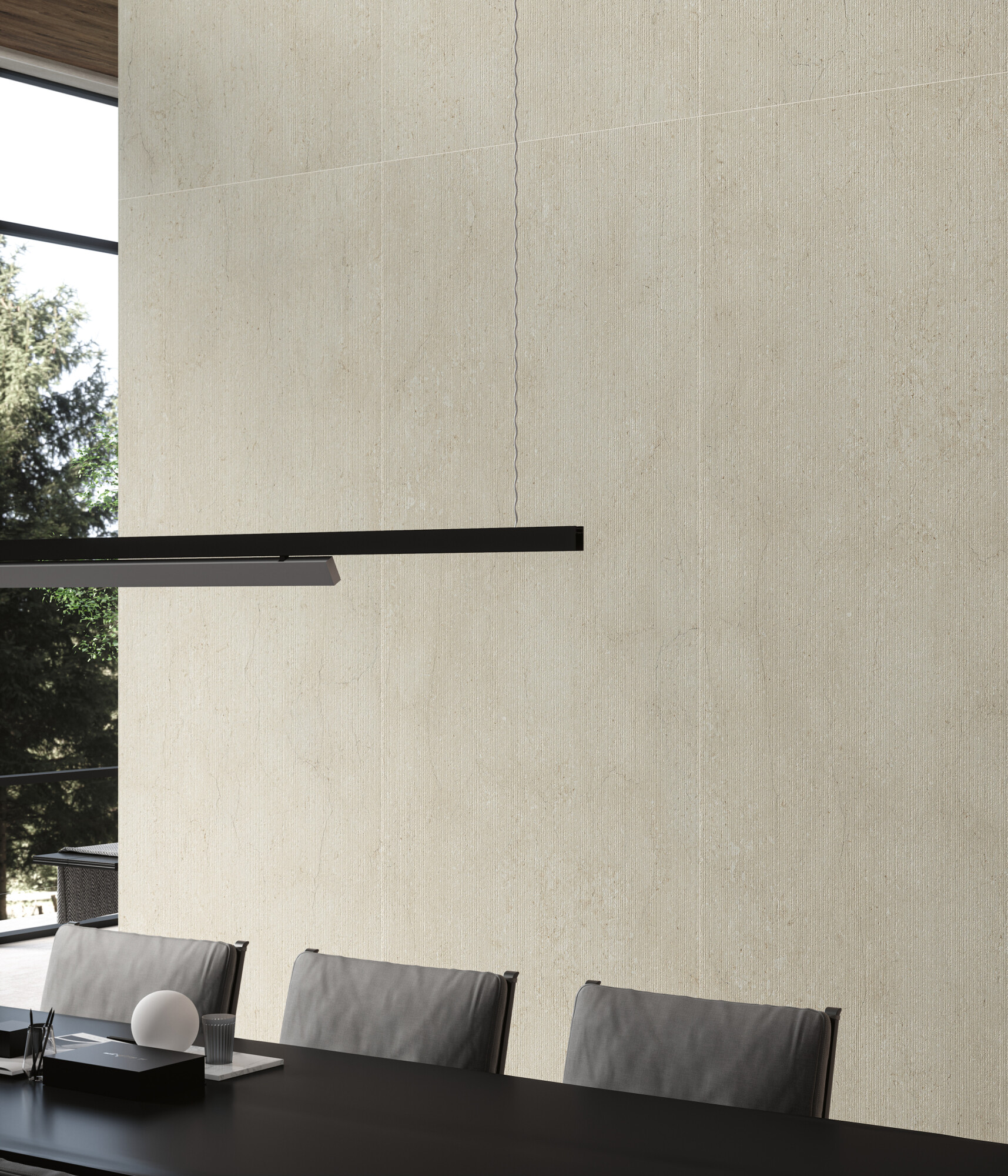 NUMEN – это новая интерпретация известняка. Мягкая каменная основа с деликатными мраморными прожилками создаёт утончённый вид. Доступны два цвета: White и Sand. Форматы: слэбы 100×275 см и настенная плитка 60×120 см. Поверхность с антискользящим покрытием anti-slip – для безопасности в любом помещении.