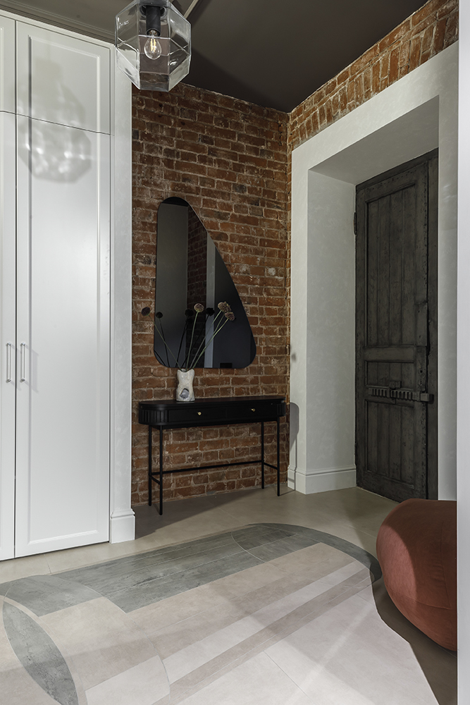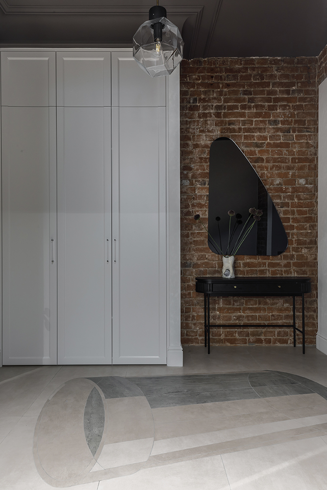 В прихожей: Пол декорирован с помощью художественной резки керамогранита ART NATURA. Сложный элемент в виде «стакана-шестигранника» встречает гостей при входе, подчеркивая геометрию пространства и высокую точность работы с материалом.