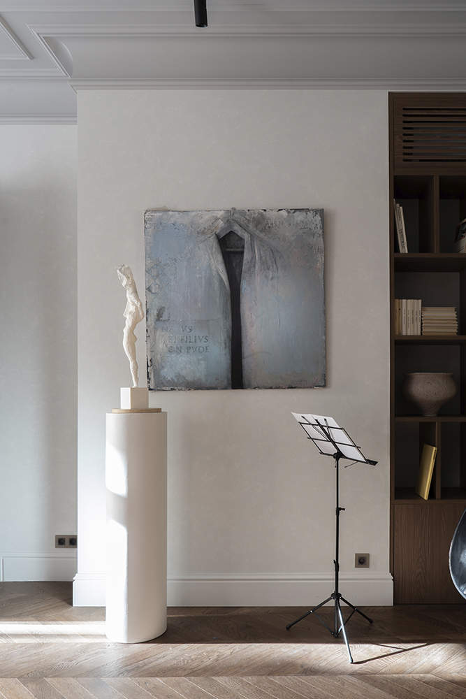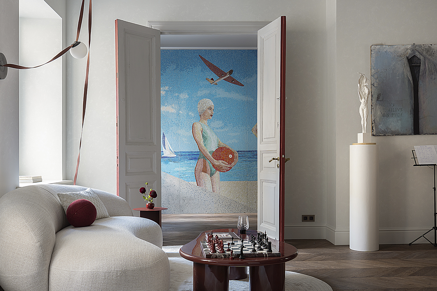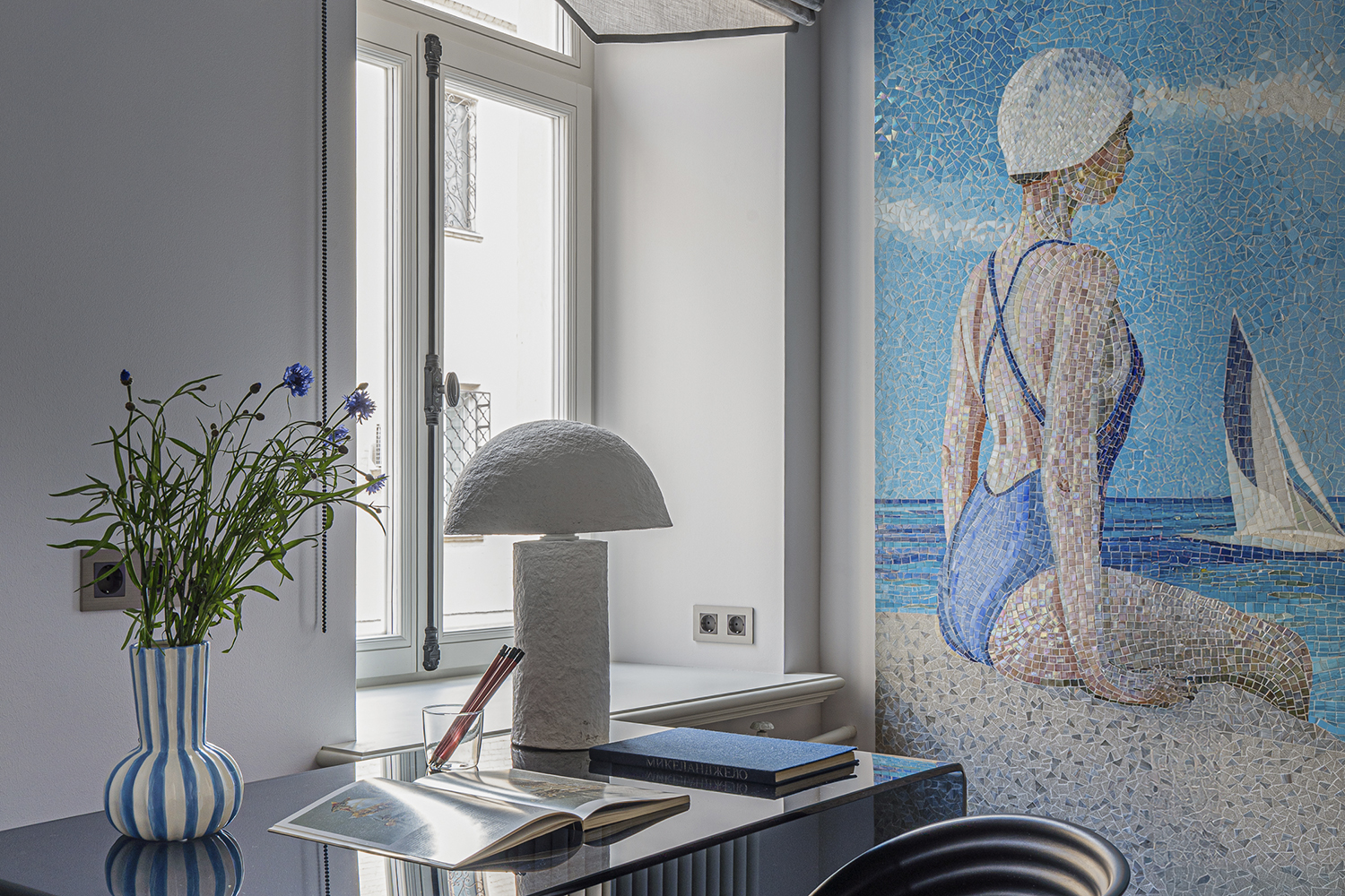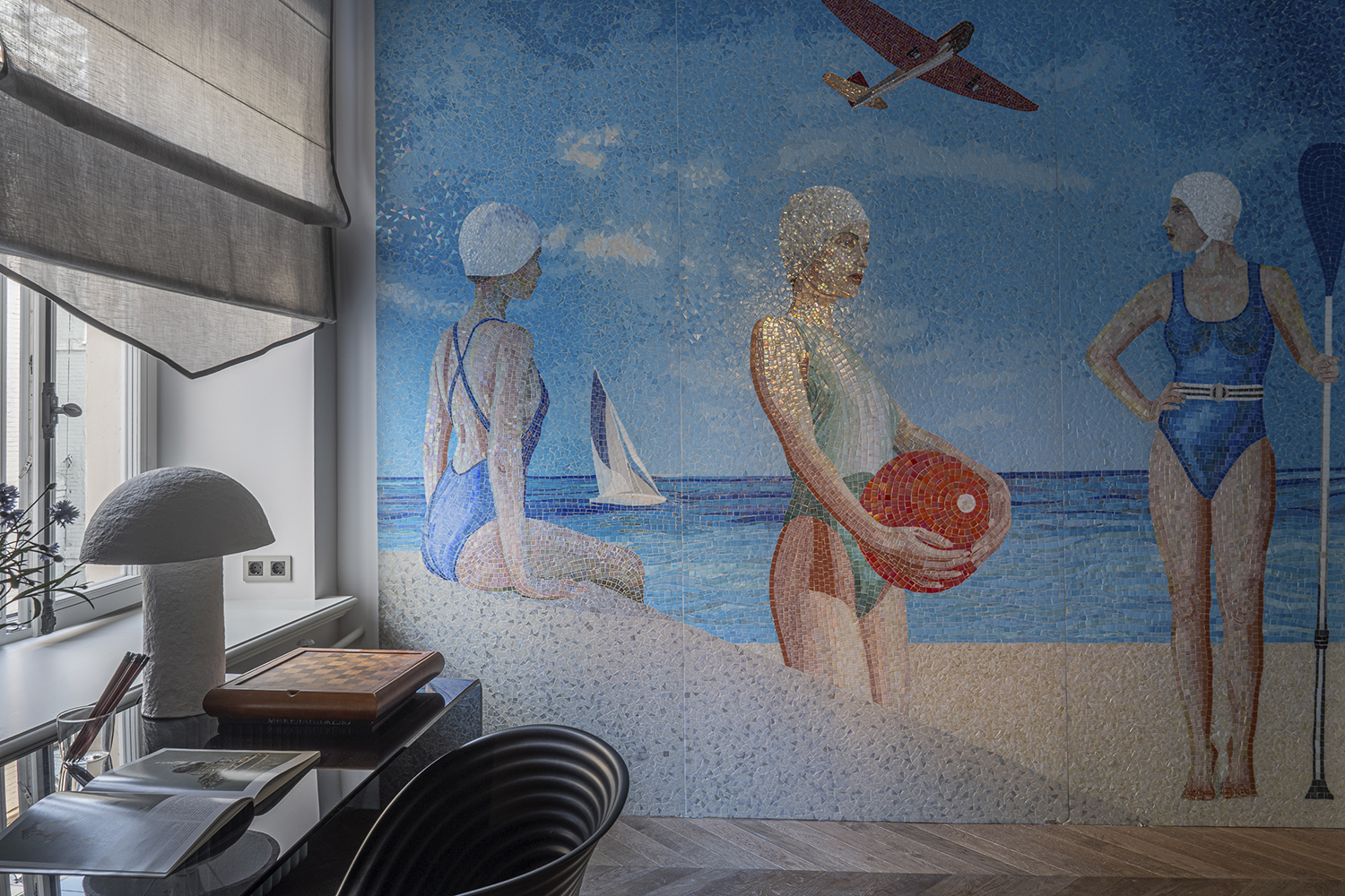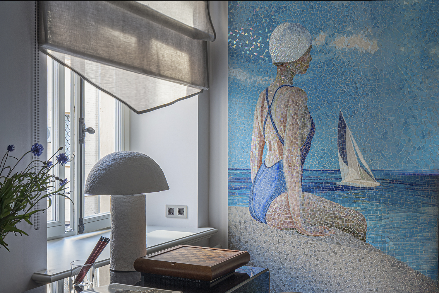 В спальне: Мозаичное панно ART NATURA «Начало» авторства художницы Ольги Солдатовой встроено в анфиладу и стало эмоциональным центром пространства. Эта авторская работа демонстрирует возможности художественной мозаики в создании уникальной атмосферы и гармонично интегрируется в архитектурное решение.