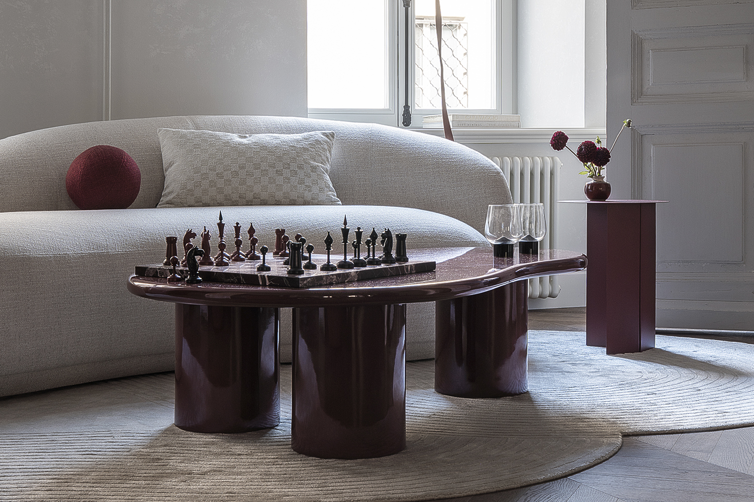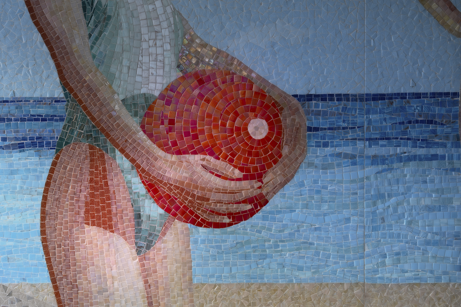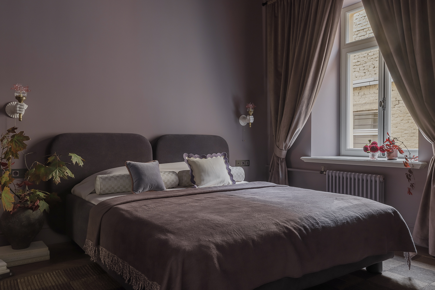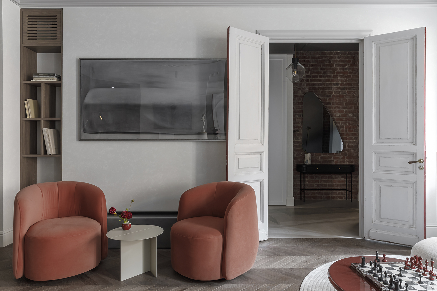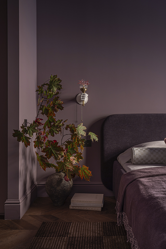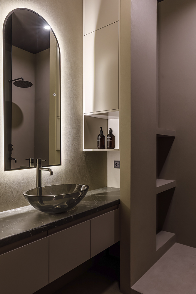 В спальне: Мозаичное панно ART NATURA «Начало» авторства художницы Ольги Солдатовой встроено в анфиладу и стало эмоциональным центром пространства. Эта авторская работа демонстрирует возможности художественной мозаики в создании уникальной атмосферы и гармонично интегрируется в архитектурное решение.